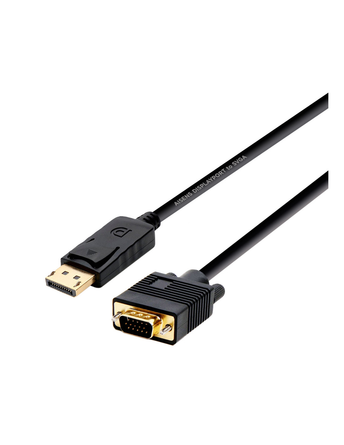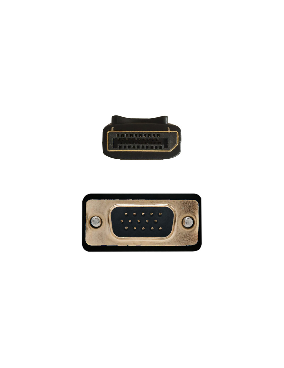Cable conversor DISPLAYPORT macho en un extremo y VGA D-SUB HDB15 macho en el otro.