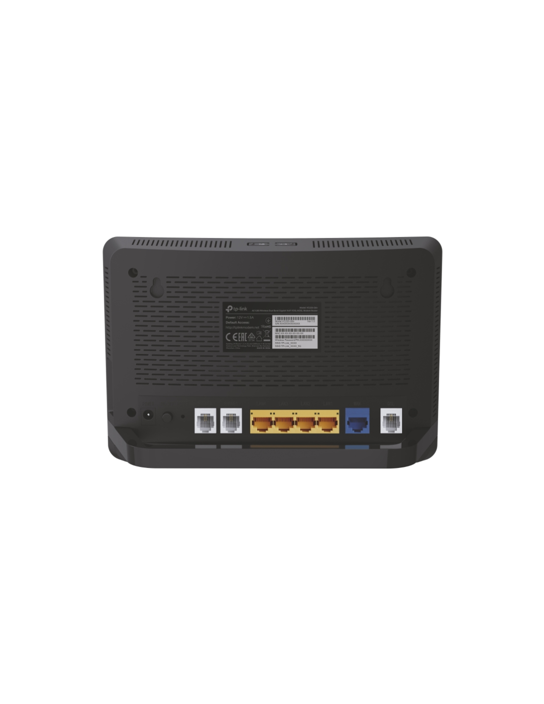 TP-Link Archer VR1210v. Banda Wi-Fi: Doble banda (2,4 GHz / 5 GHz), Estándar Wi-Fi: Wi-Fi 5 (802.11ac), Tasa de transferencia de datos WLAN (máx.): 2167 Mbit/s. Tipo de interfaz Ethernet LAN: Gigabit Ethernet, Ethernet LAN, velocidad de transferencia de datos: 10,100,1000 Mbit/s, Tecnología de cableado: 10/100/1000Base-T(X). Algoritmos de seguridad soportados: 64-bit WEP, 128-bit WEP, WPA, WPA-PSK, WPA2, WPA2-PSK, Seguridad con cortafuegos: NAT, SPI. Protocolo de conmutación: IPv4, IPv6, Protocolo de routin