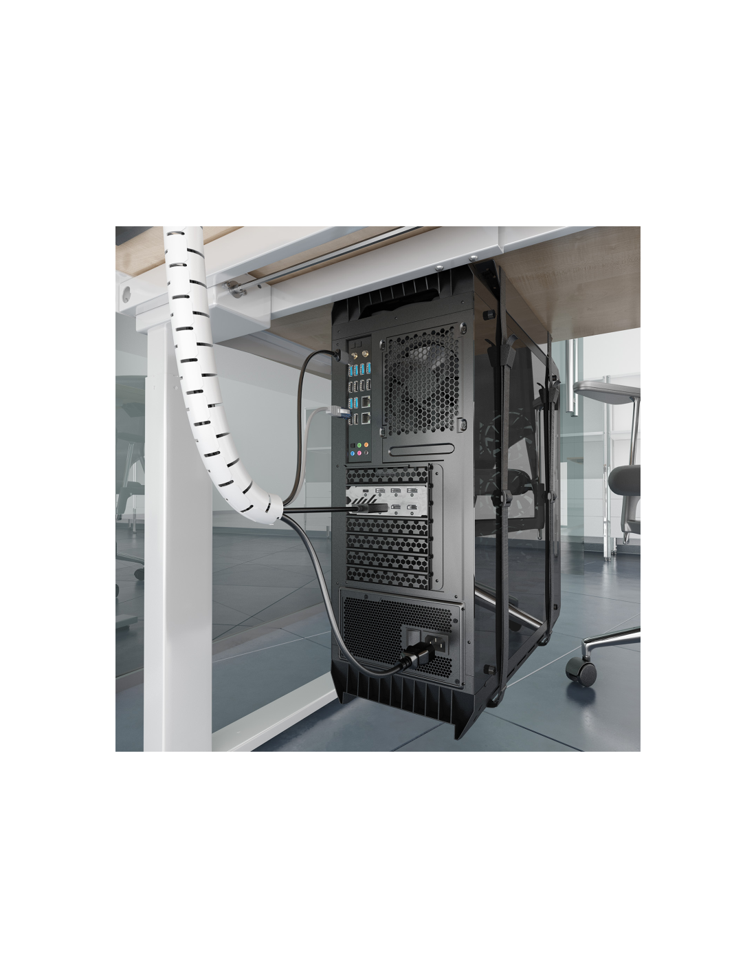 - Organizador de cables en espiral con capacidad de hasta 25mm de diámetro.