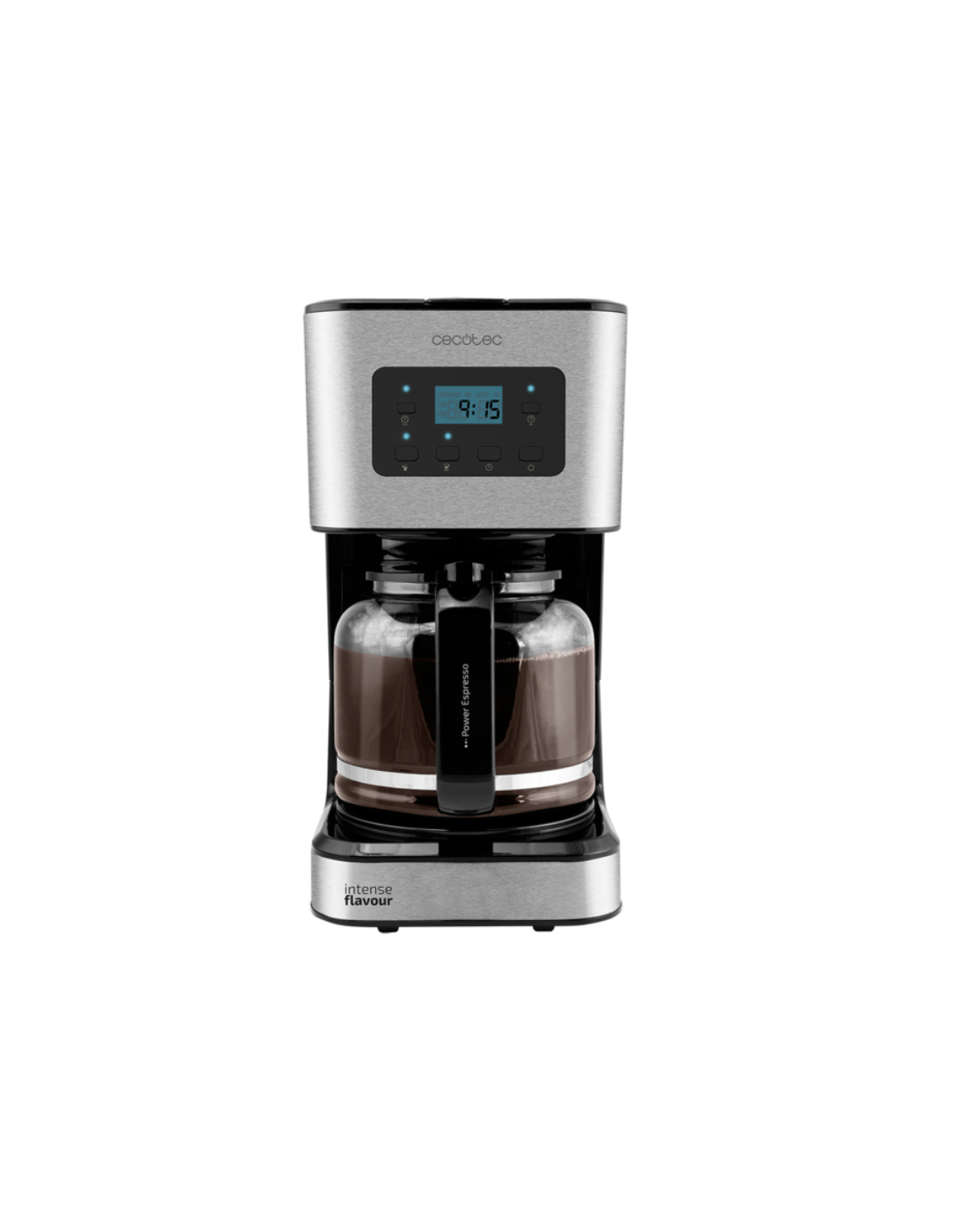 Cecotec 01555. Tipo de producto: Cafetera de filtro, Máquina de café: Semi-automática, Capacidad de reservorio de agua: 1,5 L, Café tipo de entrada: De café molido, Depósito para café preparado: Jarra, Capacidad en tazas: 12 tazas. Tipo de visualizador: LCD. Potencia: 950 W. Color del producto: Acero inoxidable