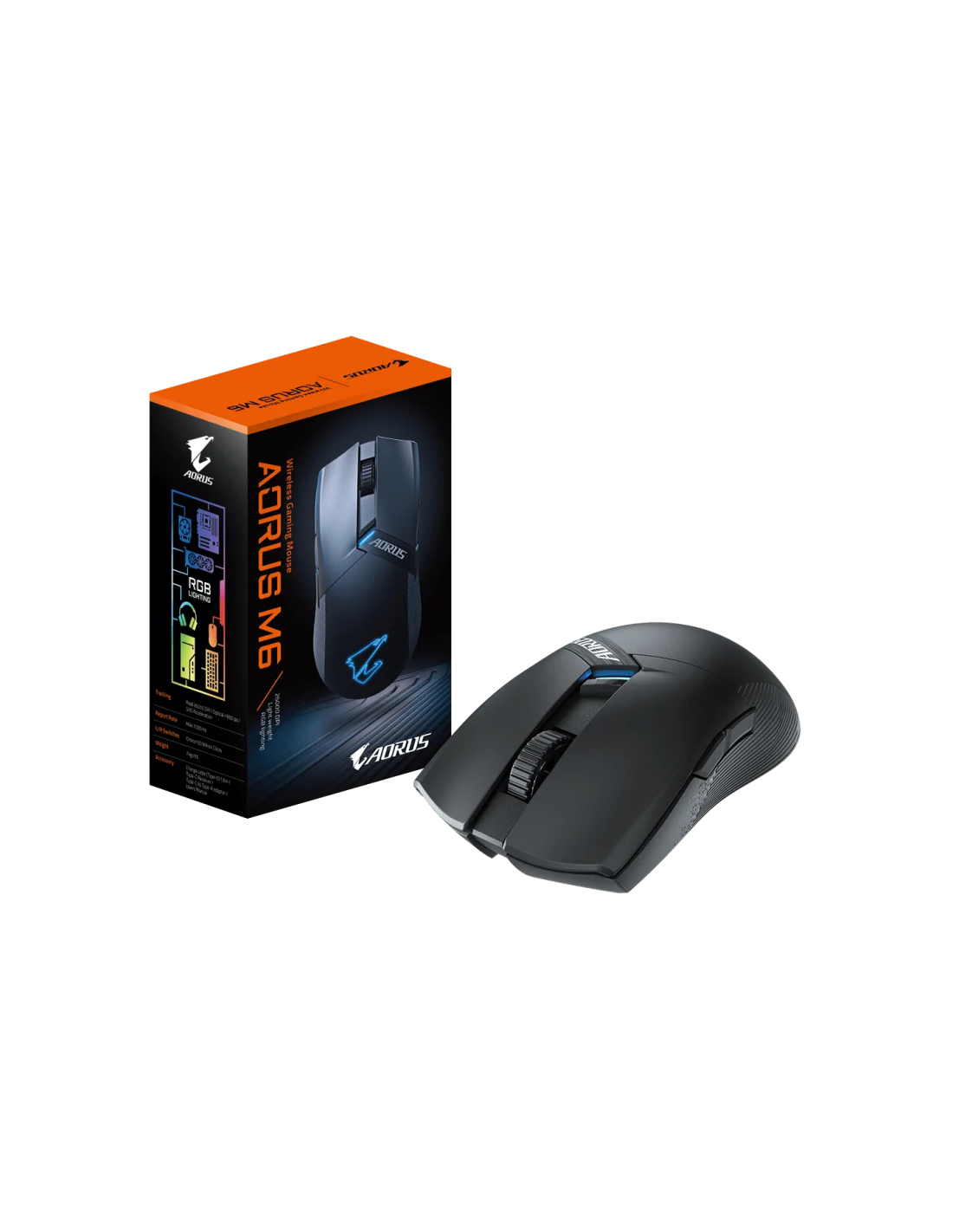 GIGABYTE AORUS M6. Factor de forma: Ambidextro. Tecnología de detección de movimientos: Óptico, Interfaz del dispositivo: USB Tipo C, Resolución de movimiento: 26000 DPI, Tiempo de respuesta: 1 ms, Tipo de botones: Botones presionados, Cantidad de botones: 6, Tipo de desplazamiento: Rueda, Aceleración (máx.): 50 G. Iluminación de color: Azul, Verde, Rojo. Fuente de energía: Baterías. Color del producto: Negro