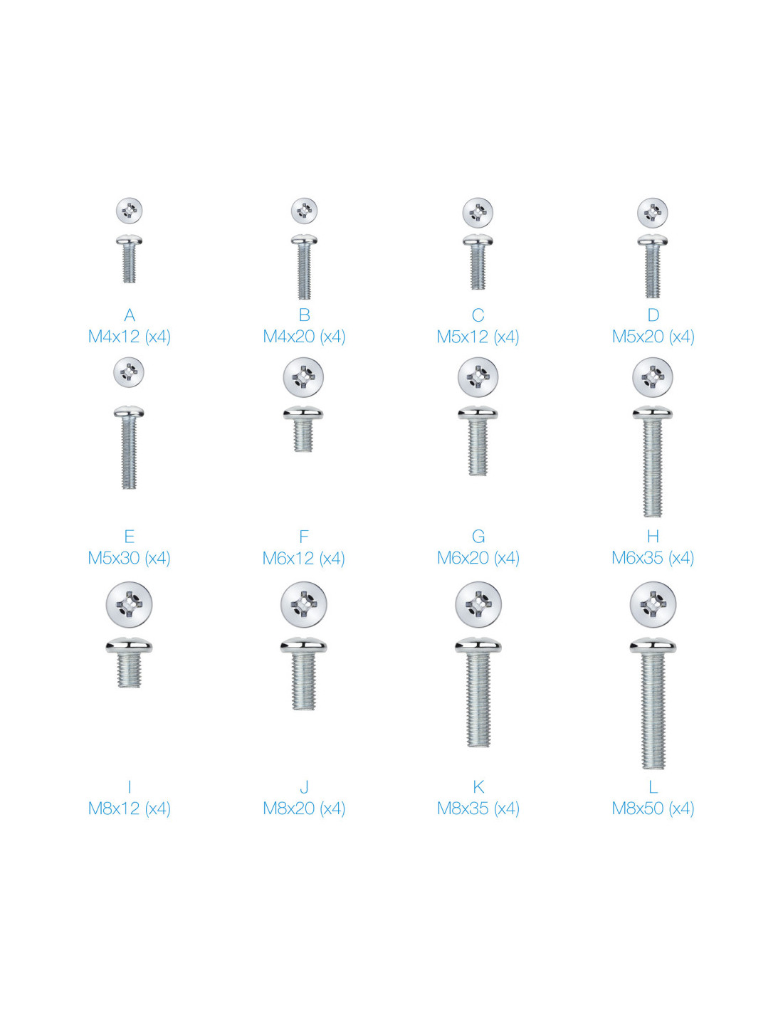 - 4 unidades de M4x12, 4 unidades de M4x20, 4 unidades de M5x12, 4 unidades de M5x20,