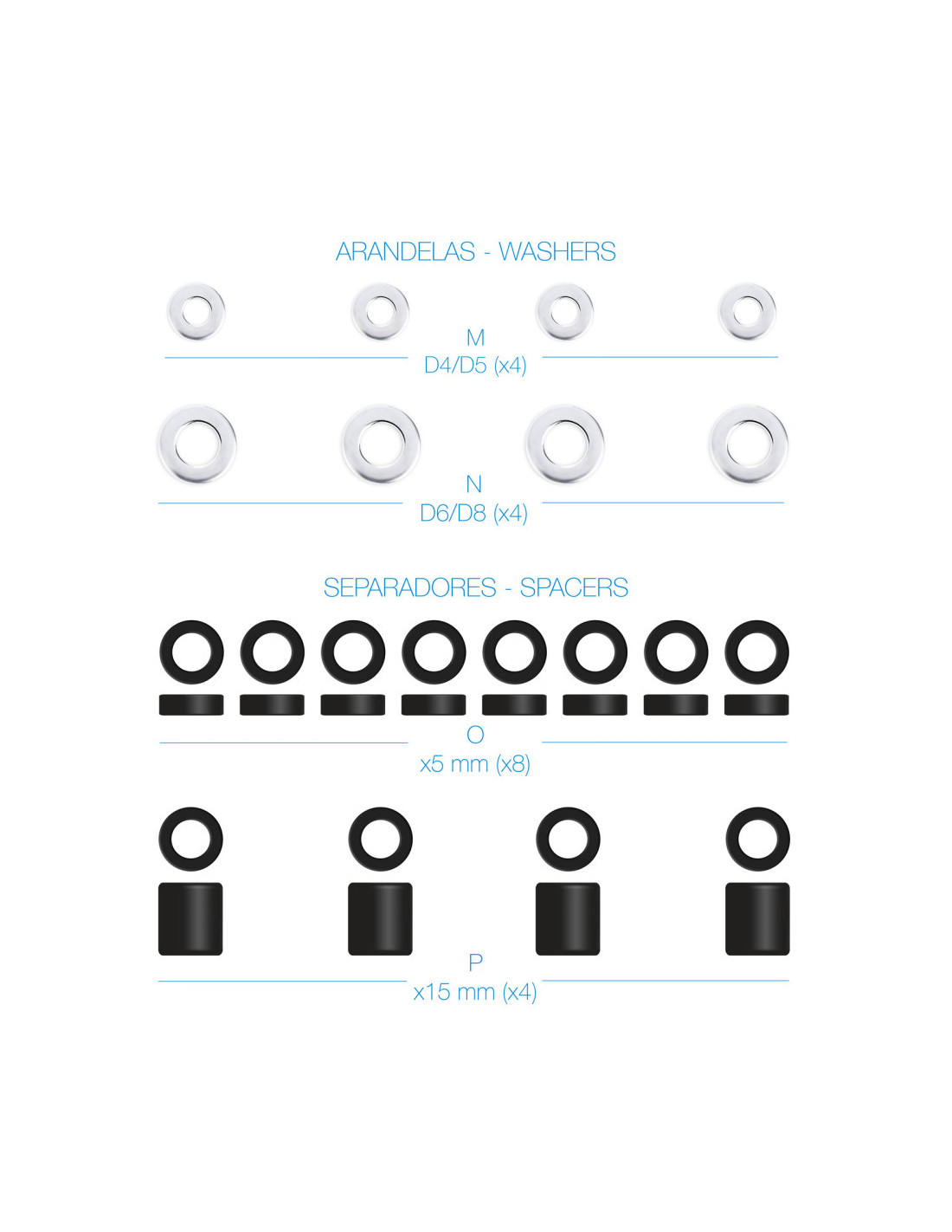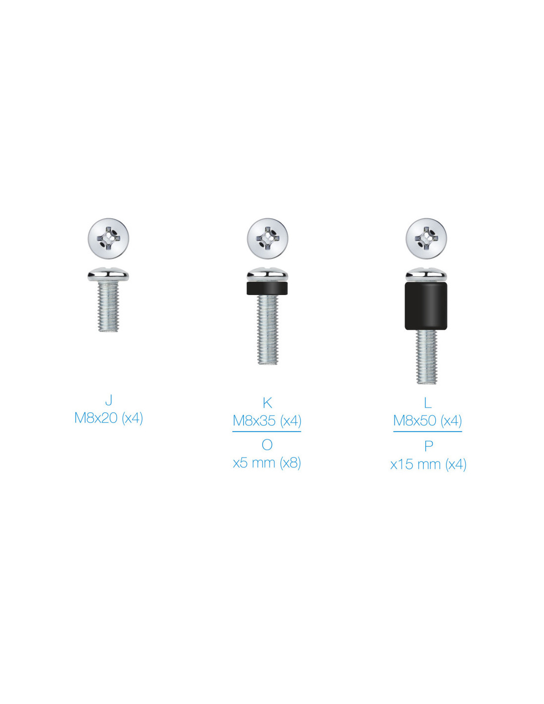 - 4 unidades de M8x12, 4 unidades de M8x20, 4 unidades de M8x35 y 4 unidades de M8x50