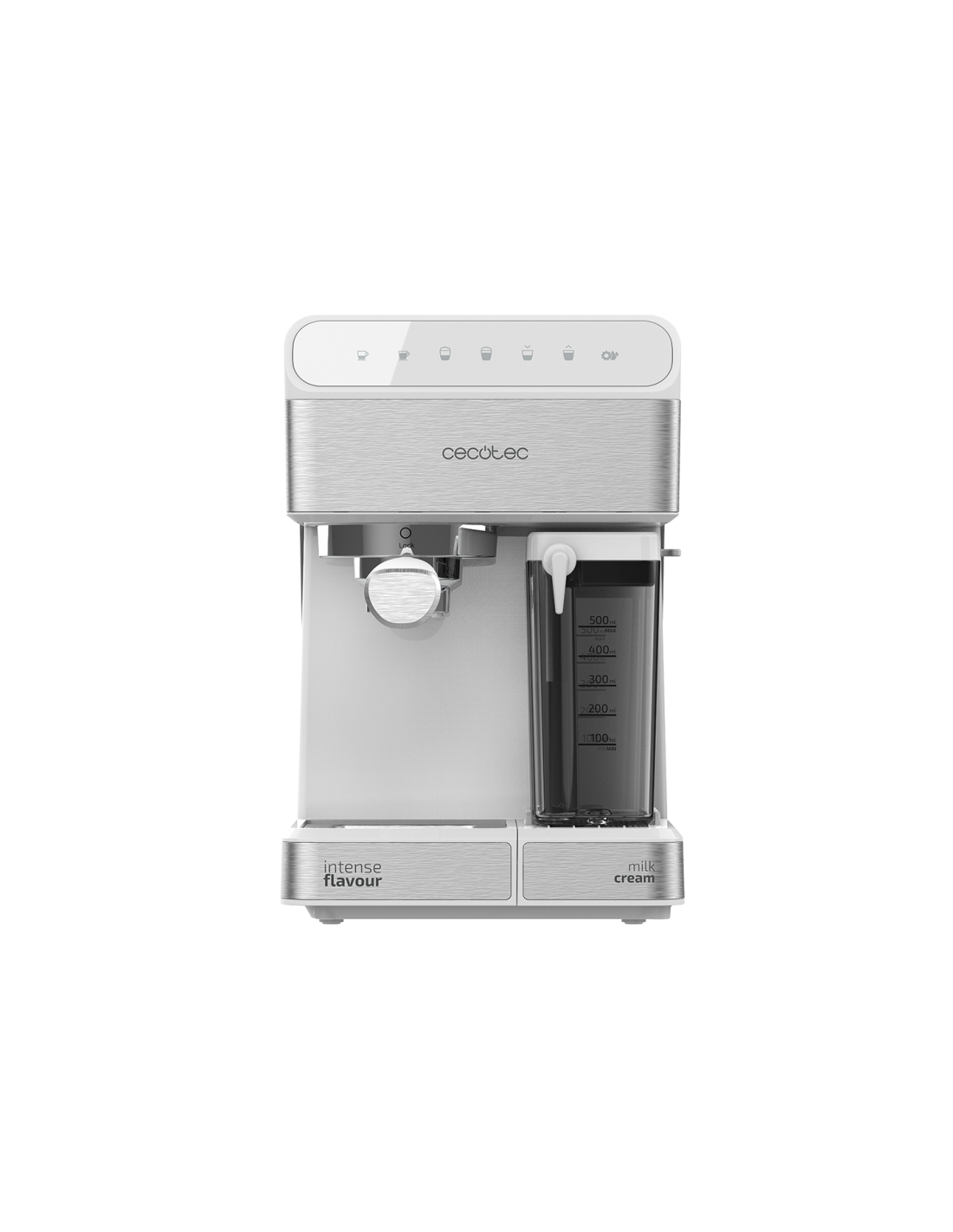 Incluye un depósito de leche Full-Milk de 500 ml de capacidad como accesorio para poder realizar directamente el cappuccino, el latte o la leche caliente. Es extraíble para poder guardarlo en la nevera y conservar la leche fresca. Podrás configurar la cantidad de crema o espuma que quieres con la palanca de su lateral.