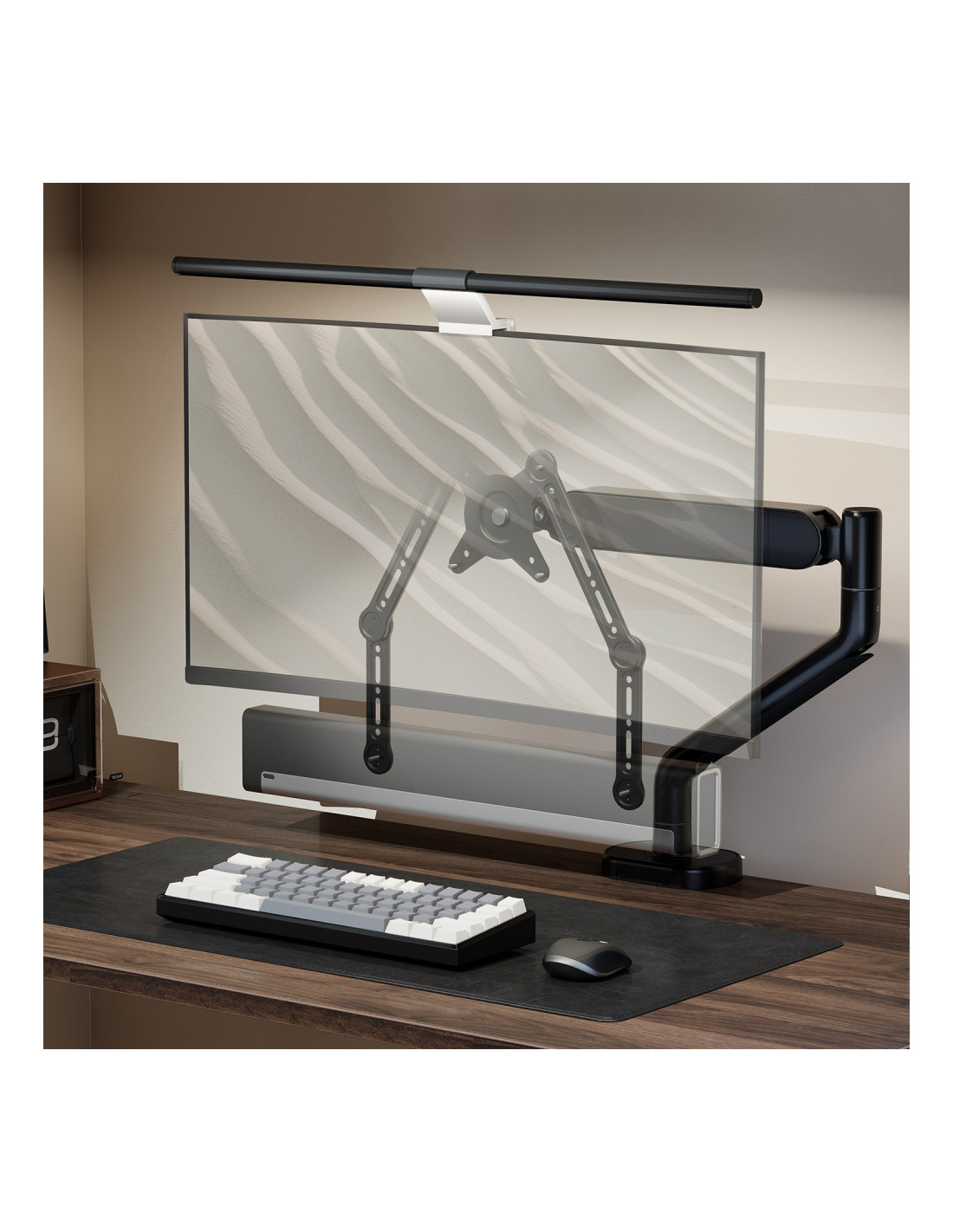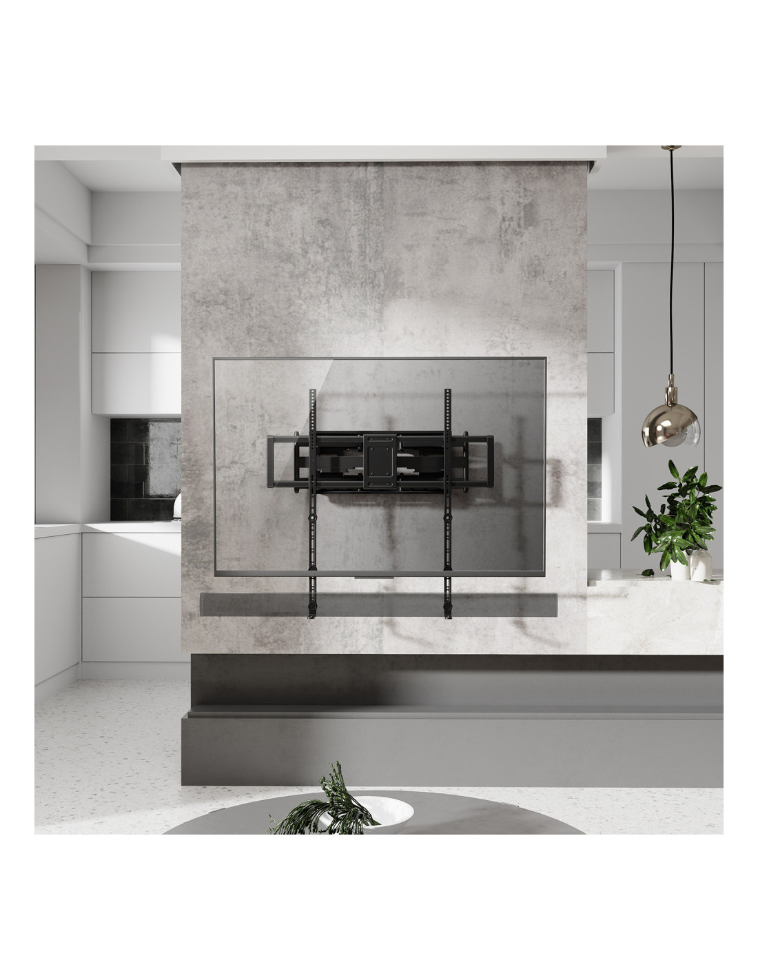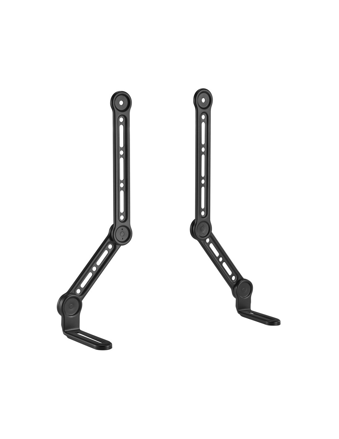 > Soporte ajustable para barra de sonido con doble pivote.