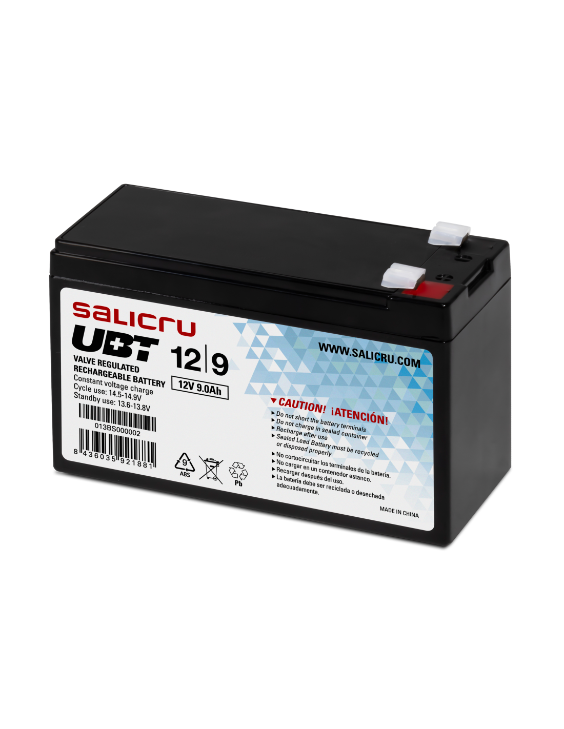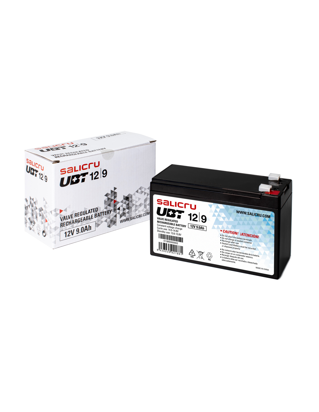 Salicru UBT 12/9. Tecnología de batería: Sealed Lead Acid (VRLA), Voltaje de la pila: 12 V, Capacidad de la batería: 9 Ah. Certificación: CE, WEEE. Peso: 2,5 kg, Ancho: 151 mm, Altura: 94 mm