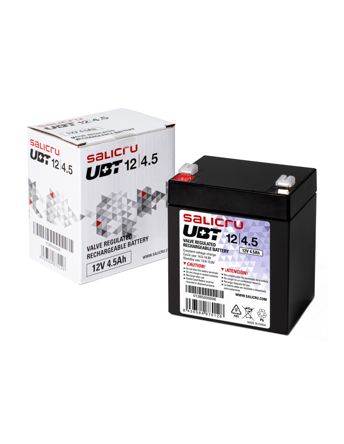 Las baterías de la serie UBT de Salicru son acumuladores de energía altamente potentes y compactos, basados en sistemas recargables de plomo-dióxido de plomo, y son especialmente óptimos para las aplicaciones de Sistemas de Alimentacion Ininterrumpida SAI/UPS y otros sistemas de seguridad que requieren de un back-up de energía fiable y de calidad. La gama de baterías UBT de Salicru incluye los modelos de 4,5 Ah, 7 Ah, 9 Ah, 12 Ah y 17 Ah, todos a 12 V. El electrolito de ácido sulfúrico se encuentra absorbido por los separadores y placas. Y éstas a su vez inmovilizadas. Están diseñados utilizando la tecnología de recombinación de gas que elimina la necesidad para la adición regular de agua mediante el control de la evolución de hidrógeno y oxígeno durante la carga. La batería está completamente sellada y hermética y por lo tanto es libre de mantenimiento, permitiendo ser utilizada en cualquier posición. En el caso que accidentalmente la batería sea sobrecargada produciendo hidrógeno y oxígeno, unas válvulas especiales unidireccionales permiten que los gases salgan al exterior evitando la sobrepresión en su interior.