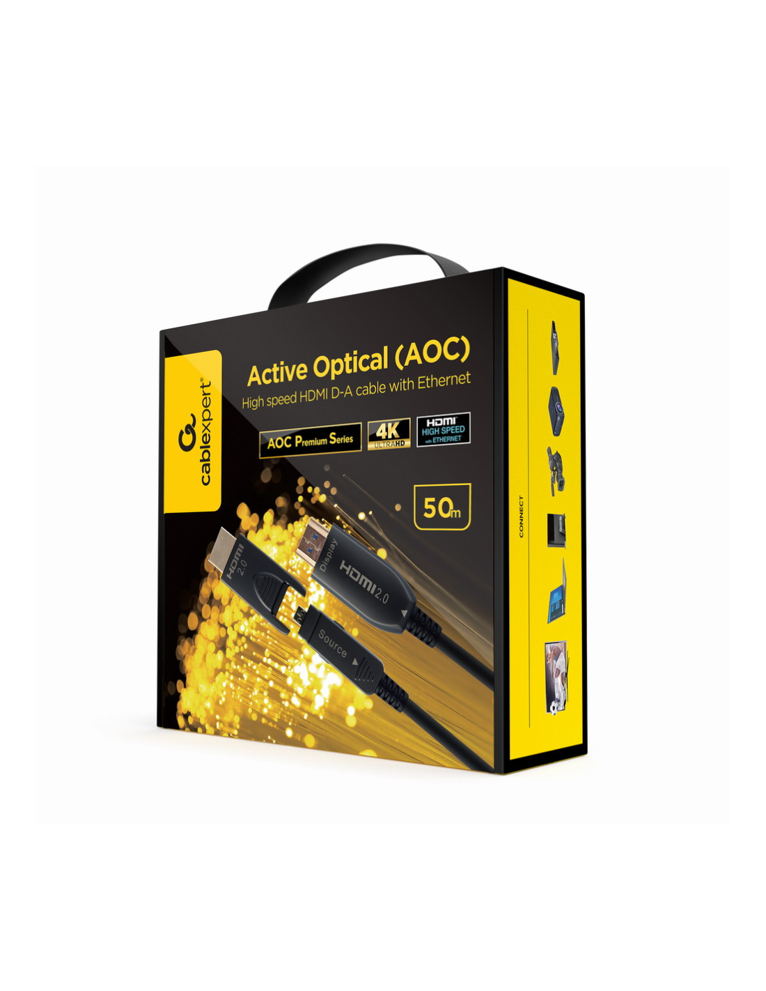 Cable HDMI AOC de alta velocidad premium con Ethernet Soporta resoluciones HDMI 2.0 4K UHD a 60 Hz El cable de fibra óptica es altamente resistente a las interferencias EMI y RFI Trenzado de nylon duradero y conectores de metal de primera calidad. Conectores chapados en oro para una calidad de imagen perfecta Compatible con todos los dispositivos compatibles con HDMI