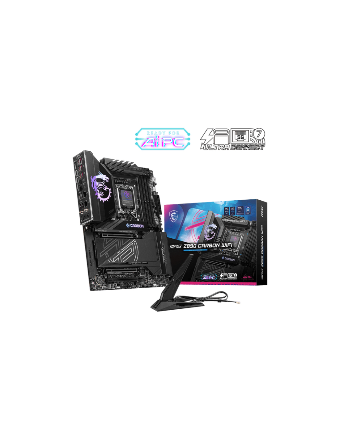 MSI MPG Z890 CARBON WIFI. Fabricante de procesador: Intel, Socket de procesador: LGA 1851 (Socket V1), Procesador compatible: Intel Core Ultra (Series 2). tipos de memoria compatibles: DDR5-SDRAM, Memoria interna máxima: 256 GB, Tipo de ranuras de memoria: DIMM. Interfaces de disco de almacenamiento soportados: M.2, SATA III, Tipos de unidades de almacenamiento admitidas: HDD & SSD, Niveles RAID: 0, 5, 10. Tipo de interfaz ethernet: 2.5 Gigabit Ethernet, 5 Gigabit Ethernet, Estándar Wi-Fi: Wi-Fi 7 (802.11be