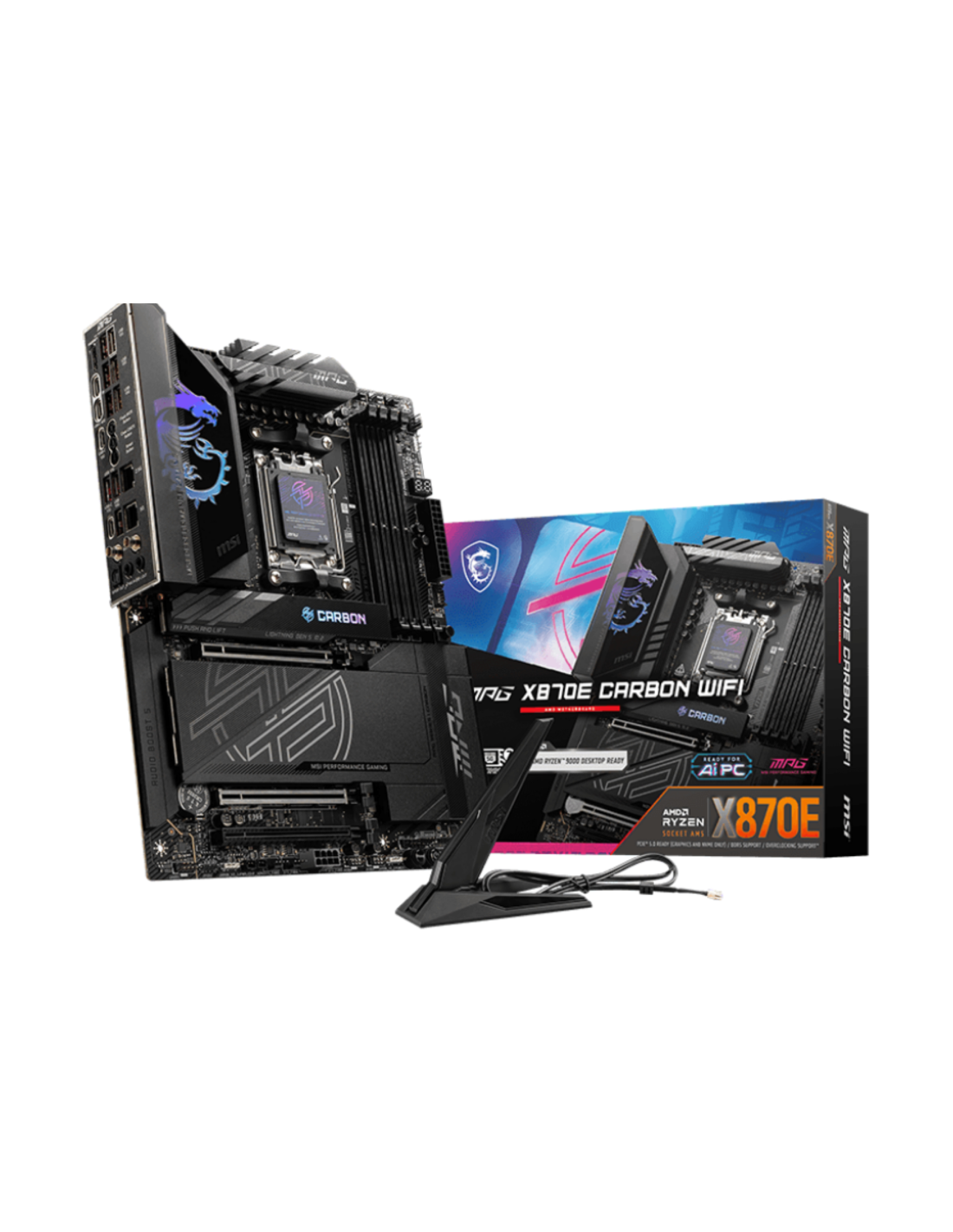 MSI MPG X870E CARBON WIFI. Fabricante de procesador: AMD, Socket de procesador: Zócalo AM5, Procesador compatible: AMD Ryzen™ 7. tipos de memoria compatibles: DDR5-SDRAM, Memoria interna máxima: 256 GB, Tipo de ranuras de memoria: DIMM. Interfaces de disco de almacenamiento soportados: M.2, SATA III, Tipos de unidades de almacenamiento admitidas: HDD & SSD. Tipo de interfaz ethernet: 2.5 Gigabit Ethernet, Estándar Wi-Fi: Wi-Fi 7 (802.11be), Wi-Fi estándares: Wi-Fi 7 (802.11be). Componente para: PC, Factor d