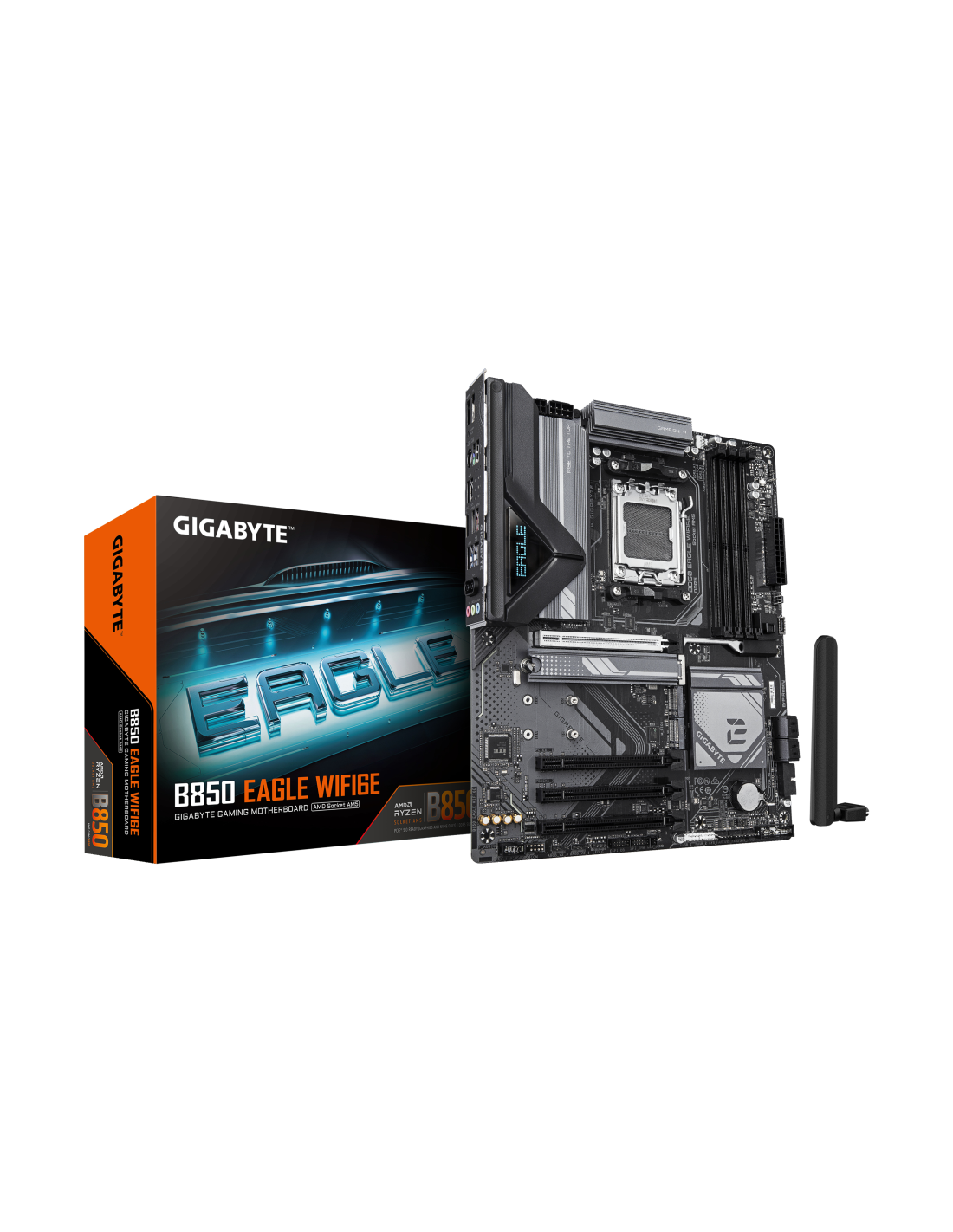 GIGABYTE B850 EAGLE WIFI6E Placa Base - Procesadores AMD Ryzen Serie 9000, VRM digital de 8+2+2 fases, hasta 8200MHz DDR5 (OC), 1xPCIe 5.0 + 2xPCIe 4.0 M.2, LAN GbE, WIFI 6E, USB 3.2 Gen 2. Fabricante de procesador: AMD, Socket de procesador: Zócalo AM5, Procesador compatible: AMD Ryzen 7000 Series, AMD Ryzen 8000 Series, AMD Ryzen 9000 Series. tipos de memoria compatibles: DDR5-SDRAM, Memoria interna máxima: 256 GB, Tipo de ranuras de memoria: DIMM. Interfaces de disco de almacenamiento soportados: M.2, SA