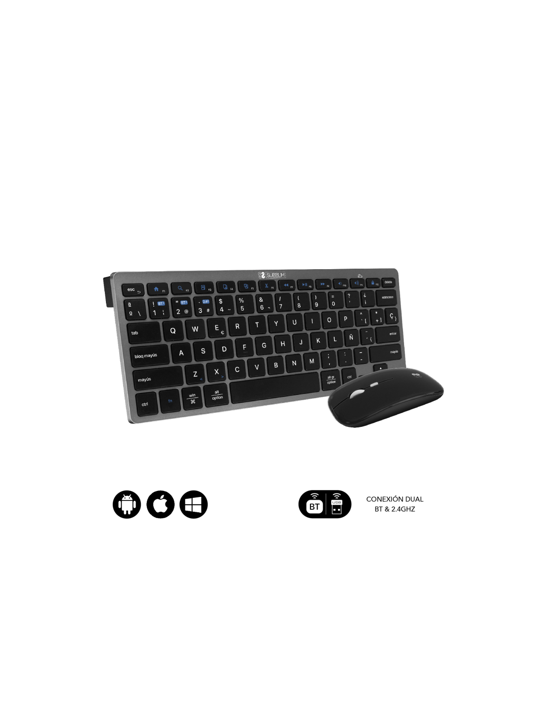 Triple conexión. El Combo de Subblim es ideal si deseas disfrutar de la libertad de trabajar con varios dispositivos a la vez. Su funcionalidad de emparejamiento triple le permite conectar hasta tres dispositivos al teclado, dos mediante tecnología inalámbrica Bluetooth y otro mediante radio frecuencia 2.4G. Podrás conectar de forma simultánea el Ordenador portátil, el teléfono móvil y la Tablet cambiando entre ellos de una forma muy sencilla.