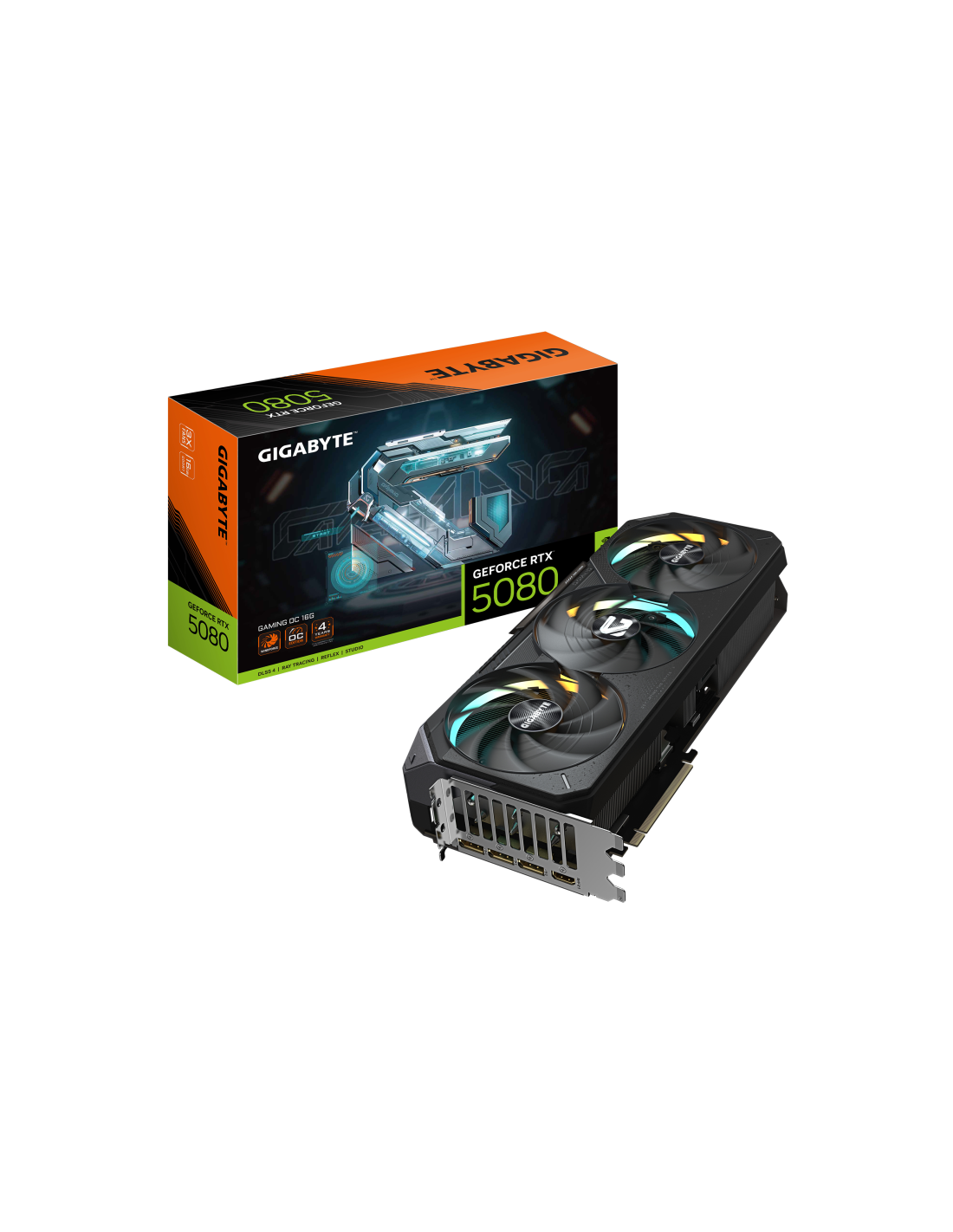 GIGABYTE GeForce RTX 5080 GAMING OC 16G Tarjeta Gráfica - 16GB GDDR7, 256 bits, PCI-E 5.0, 2730MHz Core Clock, 3 x DisplayPort, 1 x HDMI, GV-N5080GAMING OC-16GD. Familia de procesadores de gráficos: NVIDIA, Procesador gráfico: GeForce RTX 5080, Frecuencia del procesador: 2730 MHz. Capacidad memoria de adaptador gráfico: 16 GB, Tipo de memoria de adaptador gráfico: GDDR7, Ancho de datos: 256 bit, Velocidad de memoria del reloj: 28000 MHz. Máxima resolución: 7680 x 4320 Pixeles. Versión DirectX: 12.0, Versión