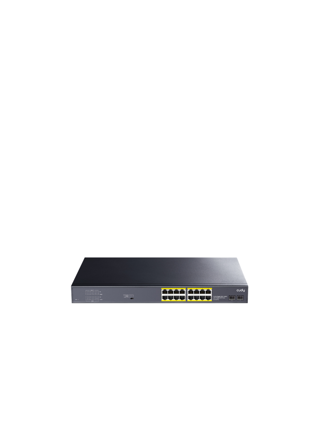 Cudy GS1020PS2. Puertos tipo básico de conmutación RJ-45 Ethernet: Gigabit Ethernet (10/100/1000), Cantidad de puertos básicos de conmutación RJ-45 Ethernet: 16. Tipo de switch o conmutador óptico: Gigabit Ethernet. Número de módulos SFP instalados: 2. Tabla de direcciones MAC: 8000 entradas. Estándares de red: IEEE 802.3, IEEE 802.3ab, IEEE 802.3af, IEEE 802.3at, IEEE 802.3u, IEEE 802.3x, IEEE 802.3z. Conector eléctrico: Conector de alimentación AC-in. Energía sobre Ethernet (PoE). Montaje en rack