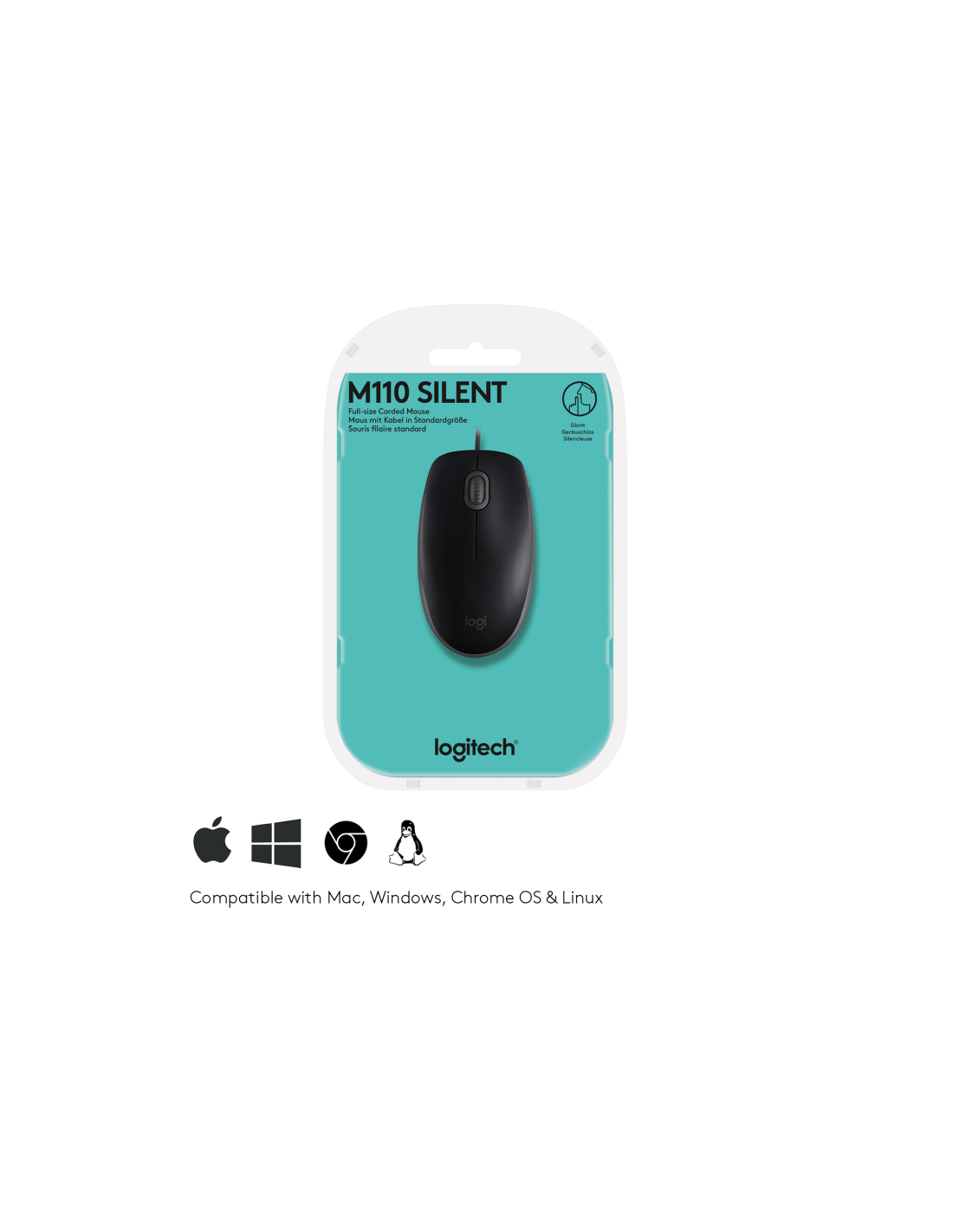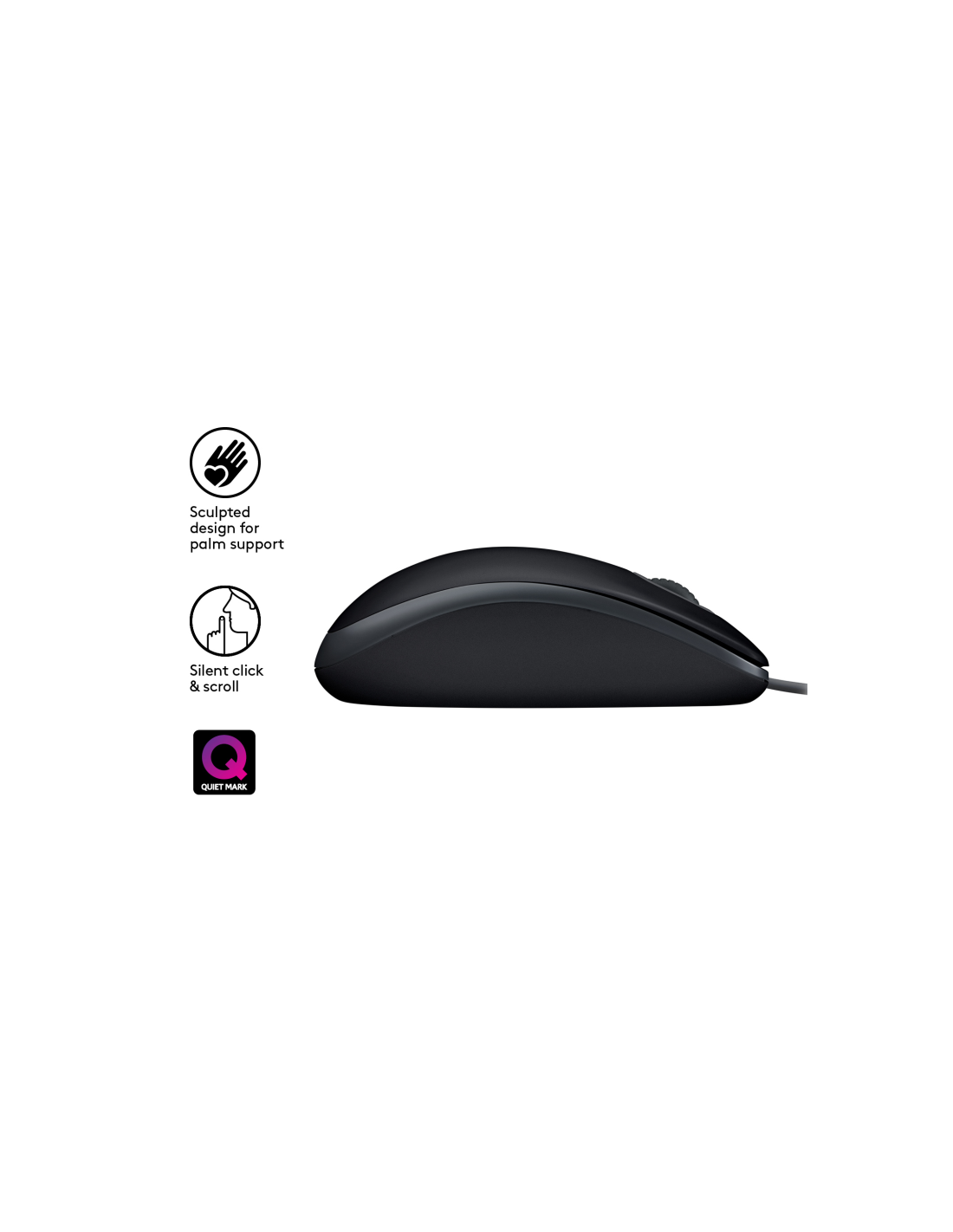 Logitech B110 Silent. Factor de forma: Ambidextro. Tecnología de detección de movimientos: Óptico, Interfaz del dispositivo: USB tipo A, Resolución de movimiento: 1000 DPI, Tipo de botones: Botones presionados, Cantidad de botones: 3, Tipo de desplazamiento: Rueda. Fuente de energía: Cable. Color del producto: Negro