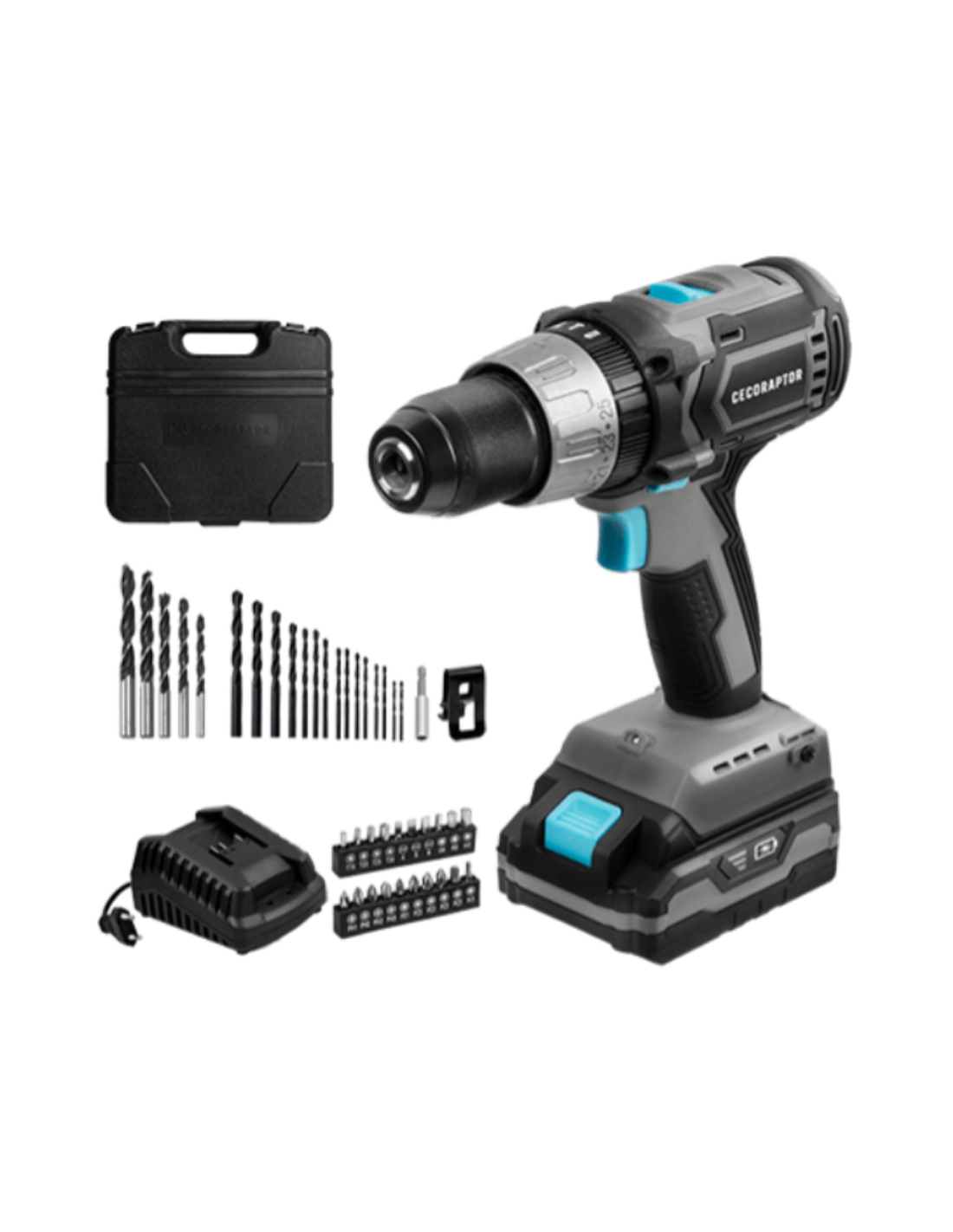 Cecotec 70008. Diseño de producto: Taladro de pistola, Tipo de motor: Sin escobillas. Capacidad de sujección (max): 1,3 cm, Velocidad de giro al ralentí (máx.): 1550 RPM, Capacidad de sujeción (min): 2 mm. Fuente de energía: Batería, Capacidad de la batería: 2000 Ah, Voltaje de la pila: 20 V. Número de brocas: 20 pieza(s)