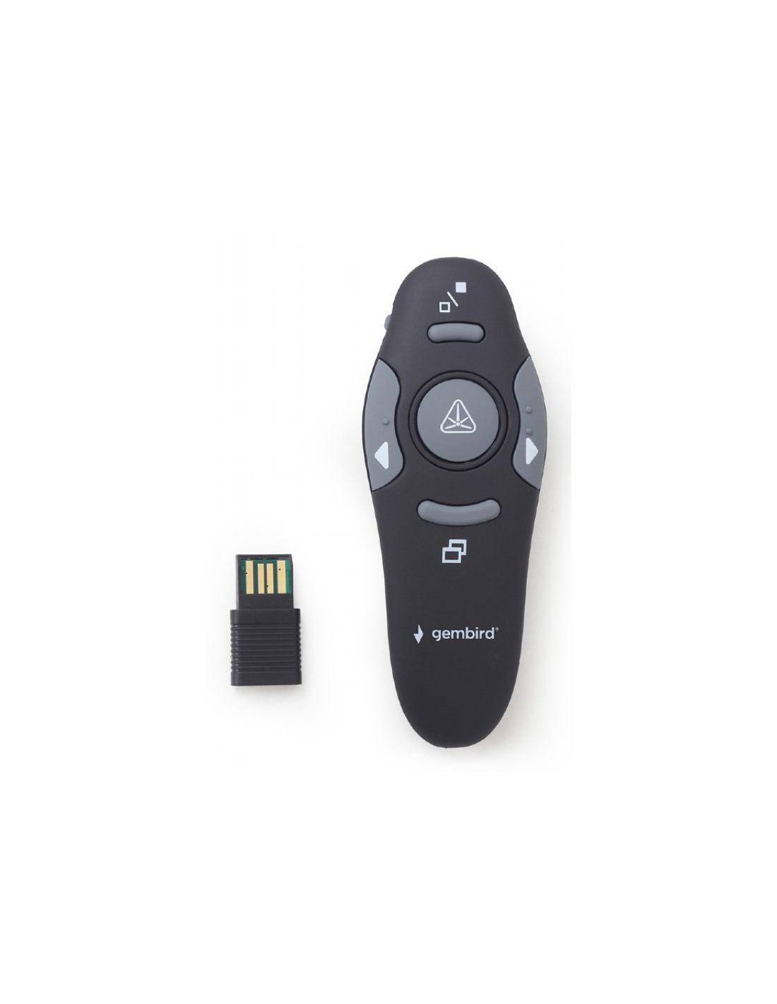 Gembird WP-L-11. Interfaz de receptor inalámbrico: USB, Tecnología inalámbrica: RF, Frecuencia de banda: 2.4 GHz. Color del producto: Negro, Funciones de presentador: Mando a distancia. Tecnología de batería: Alcalino, Tipo de batería: AAA. Ancho: 38 mm, Profundidad: 25 mm, Altura: 105 mm. Cantidad por paquete: 1 pieza(s), Tipo de embalaje: Caja