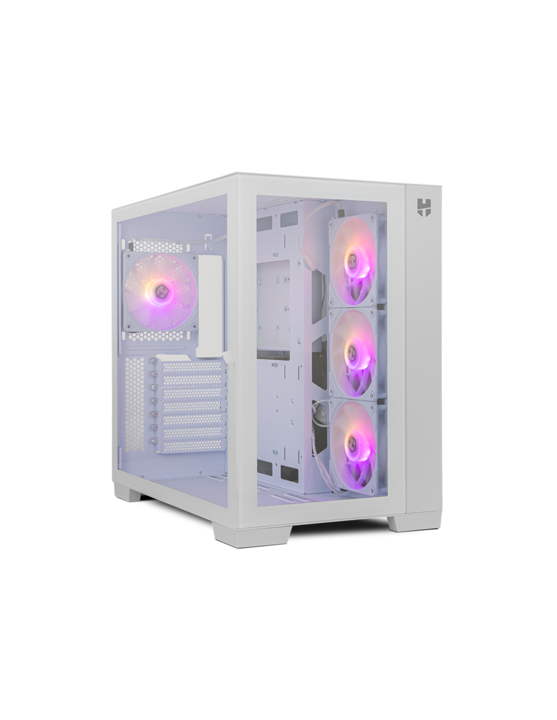 Disponible en dos colores, blanco o negro, con una impresionante estética, la Nox Hummer Astra presenta un diseño gaming minimalista. Experimenta un espectáculo visual de máximo nivel con sus doble cristal templado, uno en su frontal y otro en el lateral, quedando la configuración totalmente a la vista, disfrutando como nunca de la iluminación ARGB, gracias al controlador ARGB con mando a distancia que trae incluido.