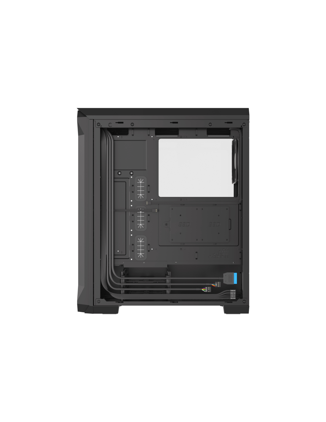 El Irid 505 V2 utiliza dos ventiladores Genesis Oxal 120 incluidos, muy silenciosos, para combatir el aire caliente. Gracias a ellos, es posible mantener un flujo de aire óptimo y, en consecuencia, la temperatura baja. Además, se pueden montar ventiladores adicionales (6 en total). Para la mejor ventilación posible de tarjetas gráficas de hasta 355 mm de longitud, el ventilador frontal Oxal 120 se monta por defecto dentro de la estructura de la caja. Para tarjetas gráficas más largas (hasta 380 mm), el mejor flujo de aire lo proporciona una configuración con los ventiladores frontales colocados fuera de la estructura, lo que puede hacer usted mismo fácilmente.