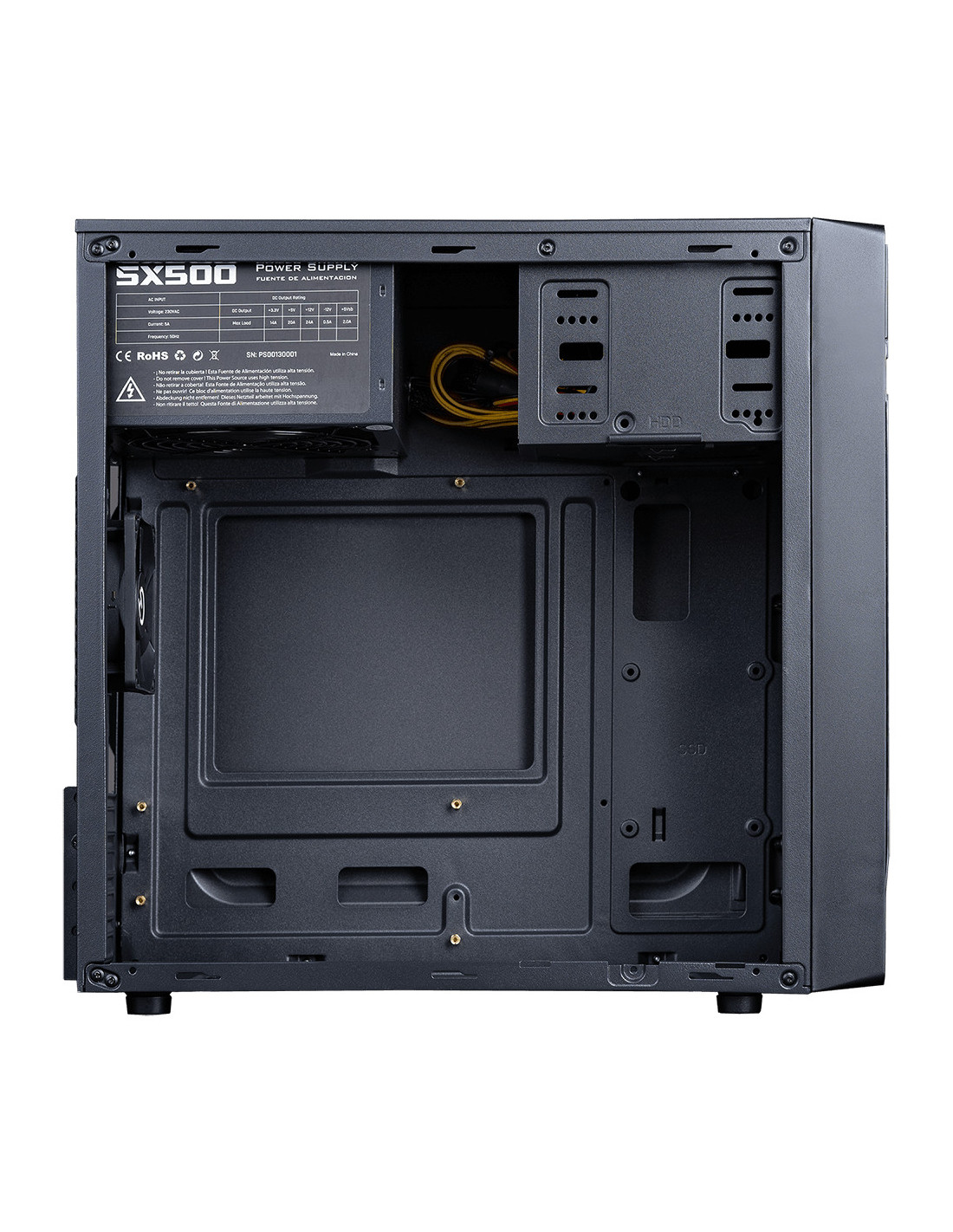 El interior del chasis dispone de amplias opciones de almacenamiento, permitiendo la instalación de 4*SSD + HDD o bién 2*SSD + 3*HDD , además cuenta con una bahía externa para unidades de 5.25".