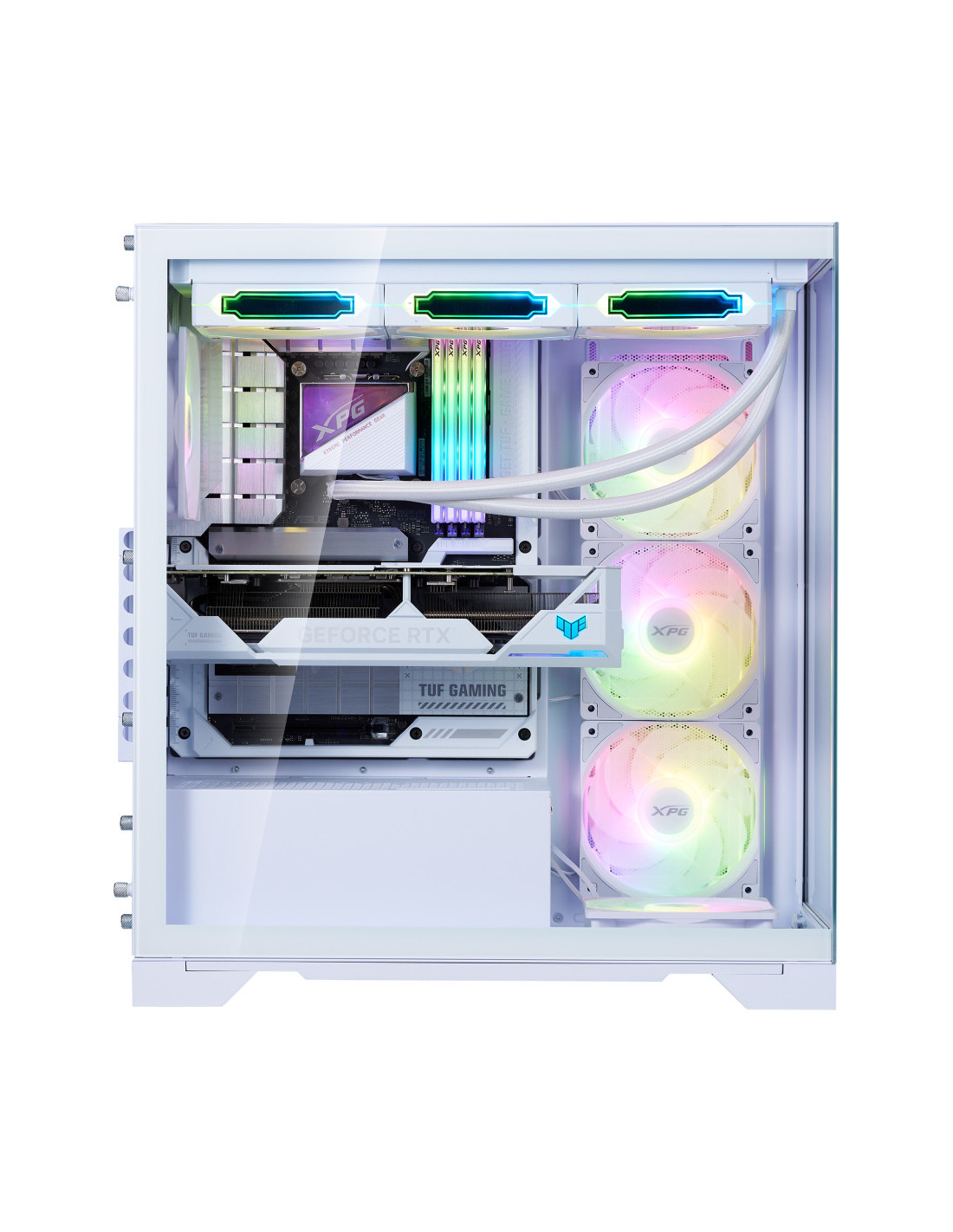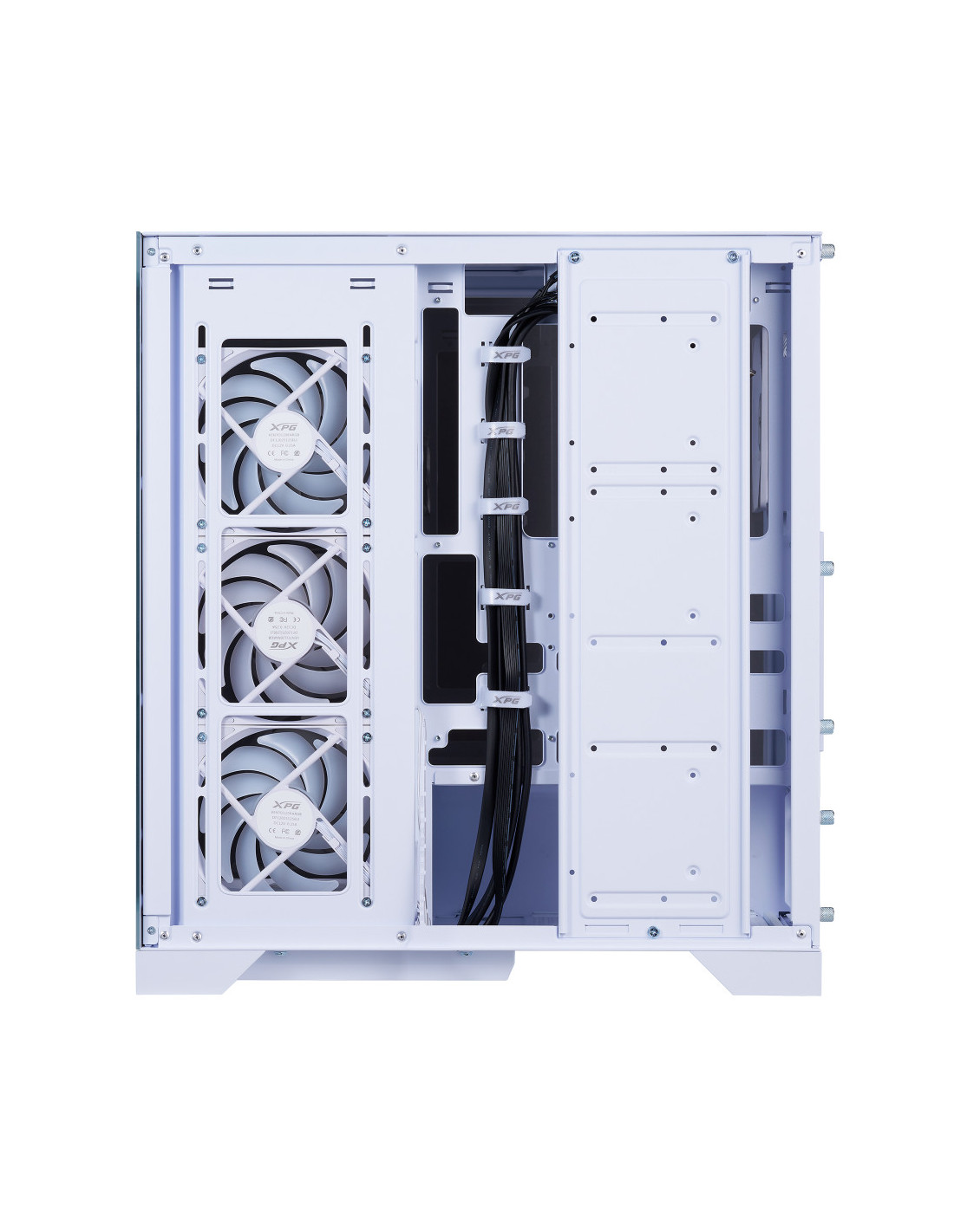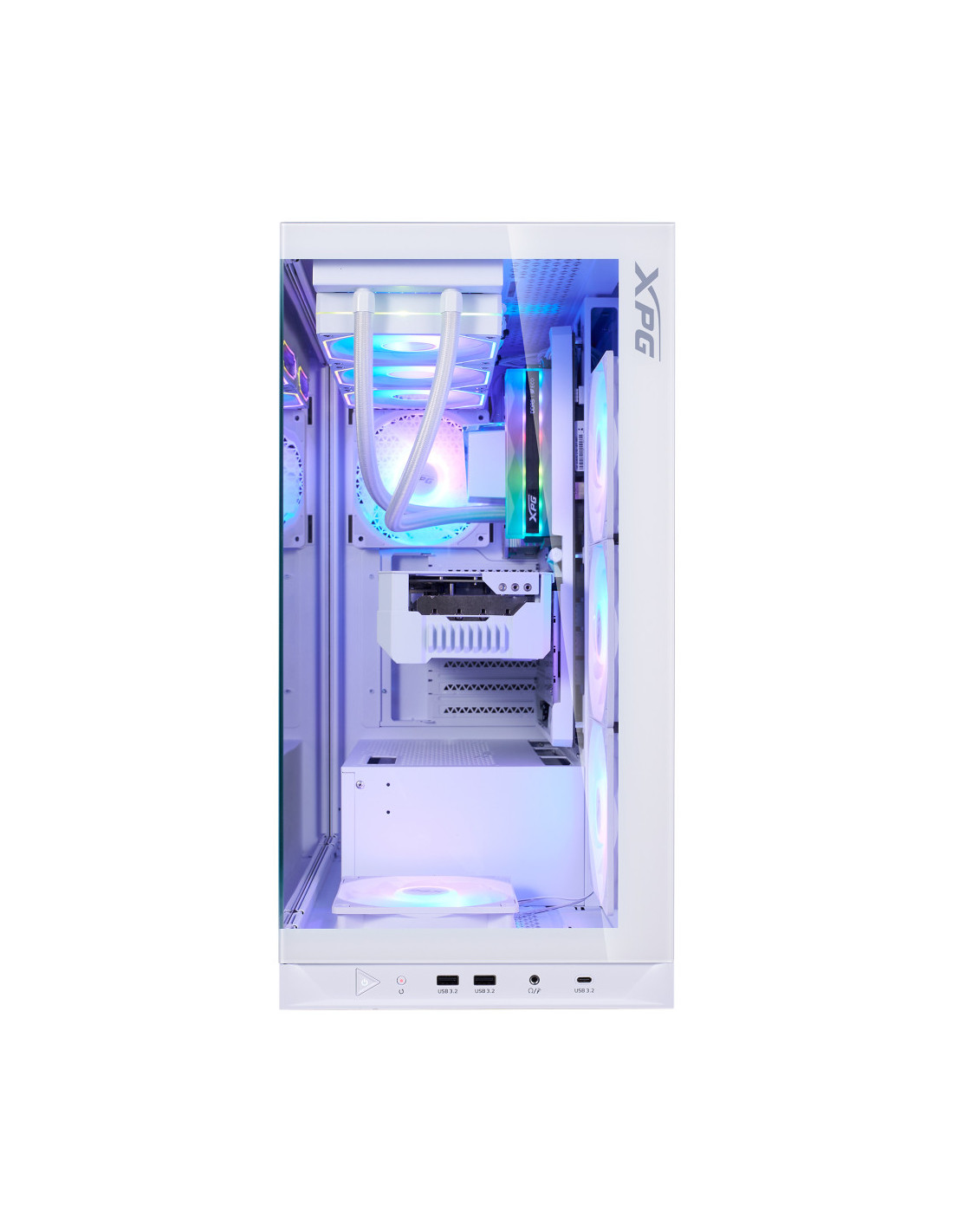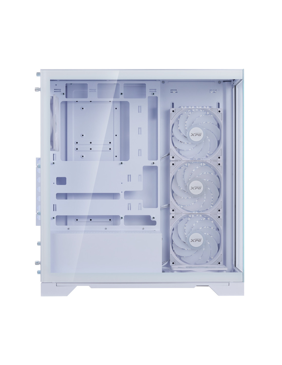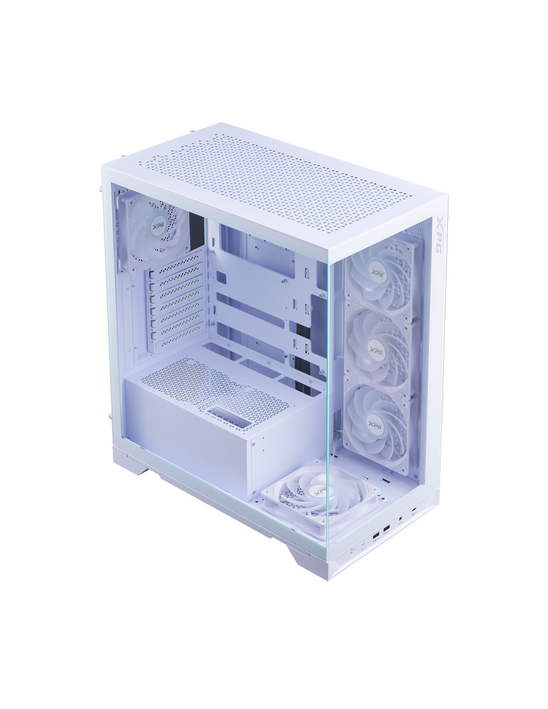 El nuevo chasis con vista al mar de XPG se caracteriza por su compatibilidad con las últimas placas base ATX de conector inverso, proporcionando la plataforma definitiva para mostrar su mejor gestión del cableado. Equipado con cuatro ventiladores invertidos preinstalados y un ventilador estándar, garantiza un rendimiento de flujo de aire óptimo a la vez que mantiene una estética elegante desde todos los ángulos.