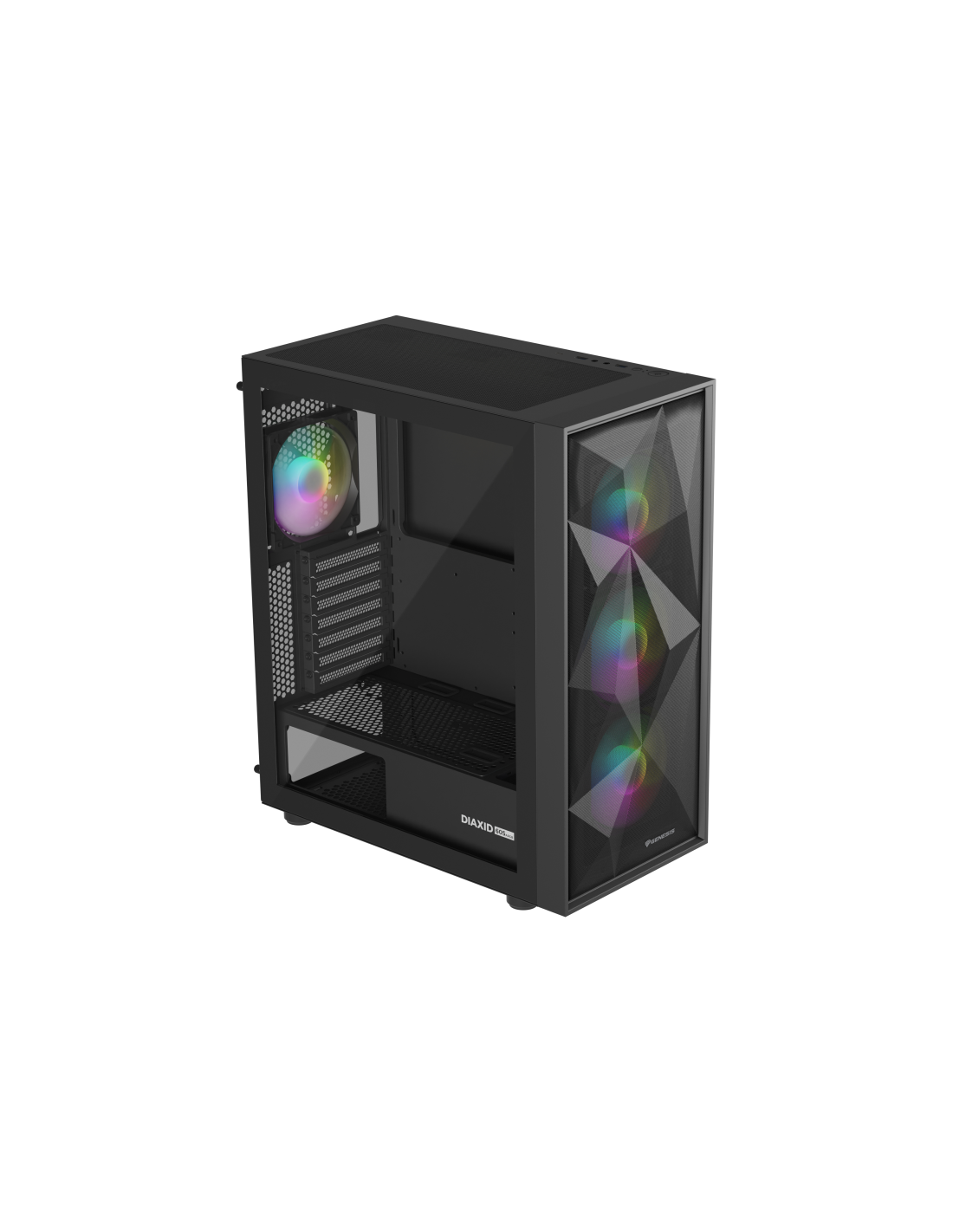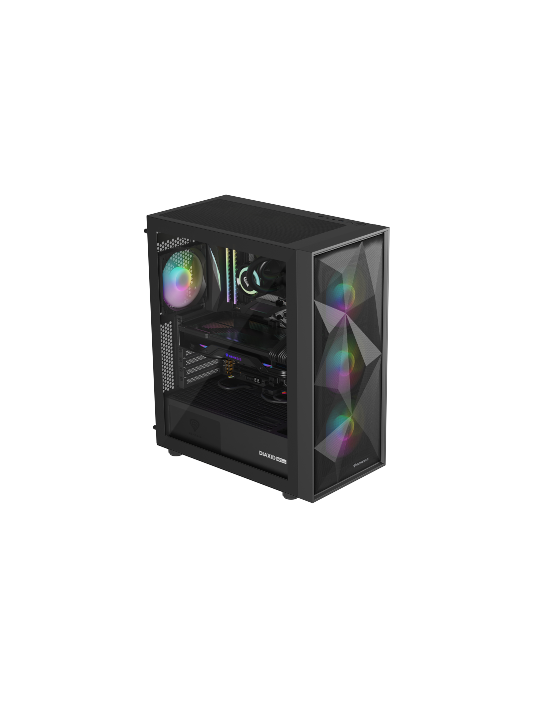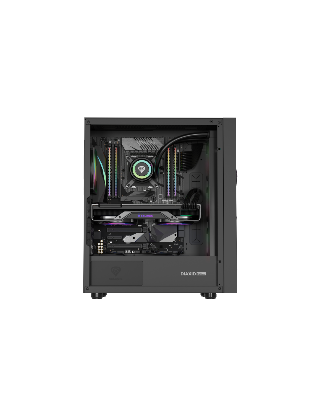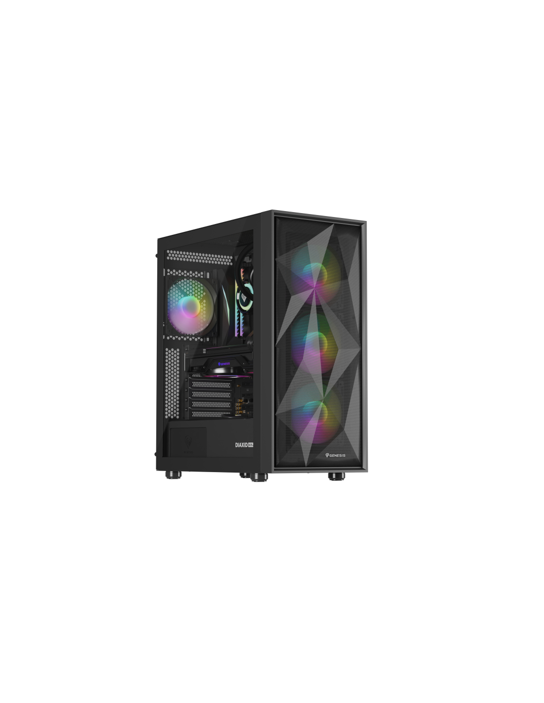 GENESIS Diaxid 605 ARGB. Factor de forma: Midi Tower, Tipo: PC, Color del producto: Negro. Ubicación de fuente de alimentación: Fondo, Factores de forma de la fuente de alimentación compatibles: ATX. Ventiladores frontales instalados: 3x 120 mm, Diámetro de ventiladores frontales soportados: 120,140 mm, Ventiladores traseros instalados: 1x 120 mm. Tamaños de disco duro soportados: 2.5,3.5". Ancho: 217 mm, Profundidad: 420 mm, Altura: 466 mm