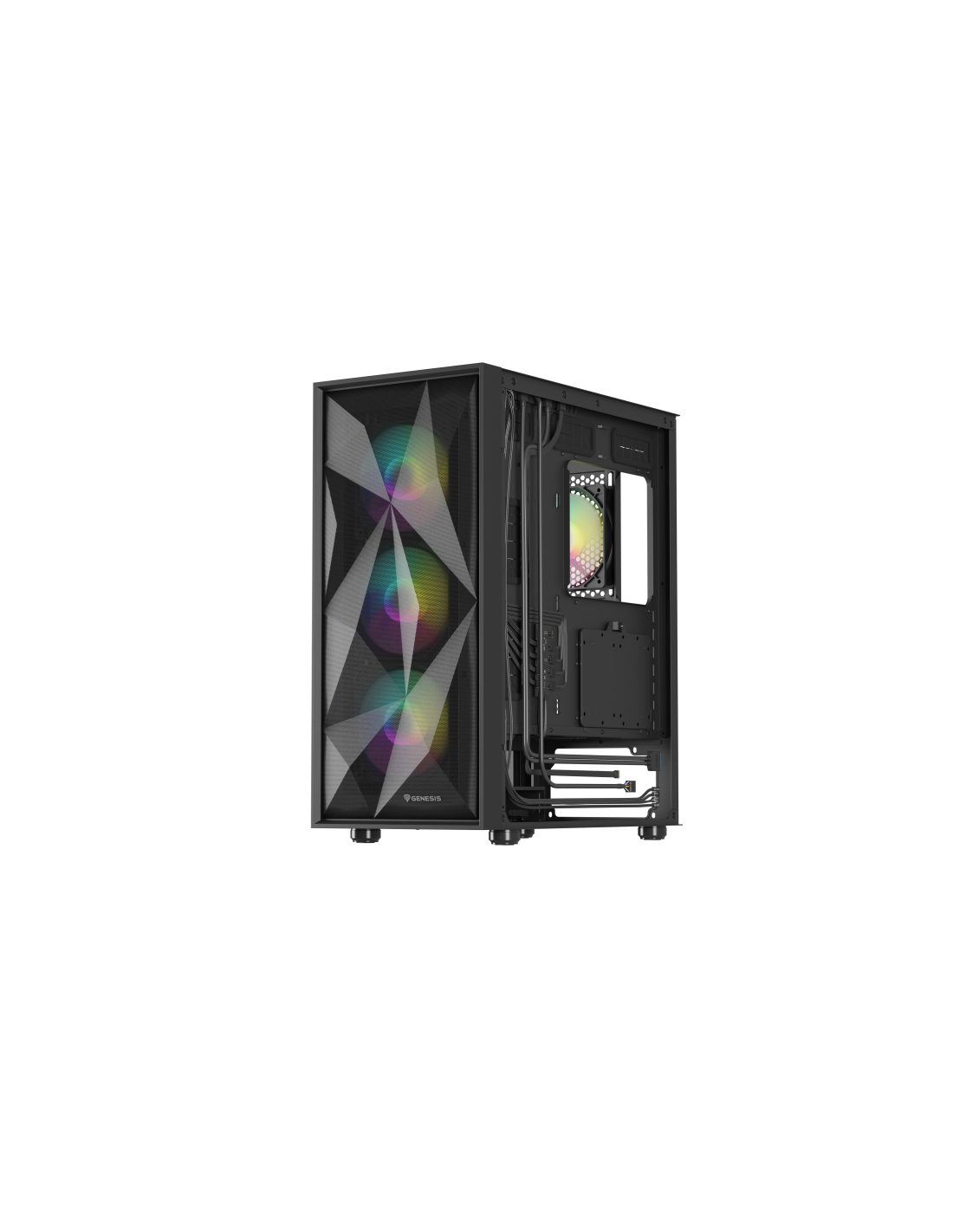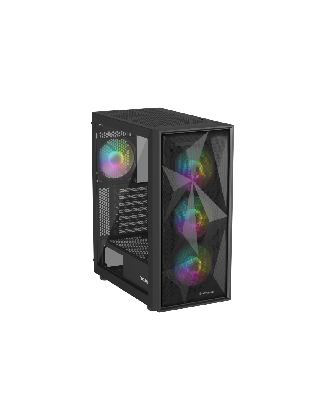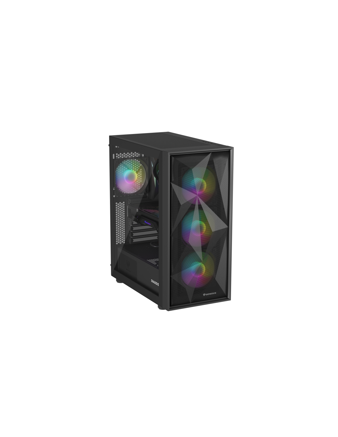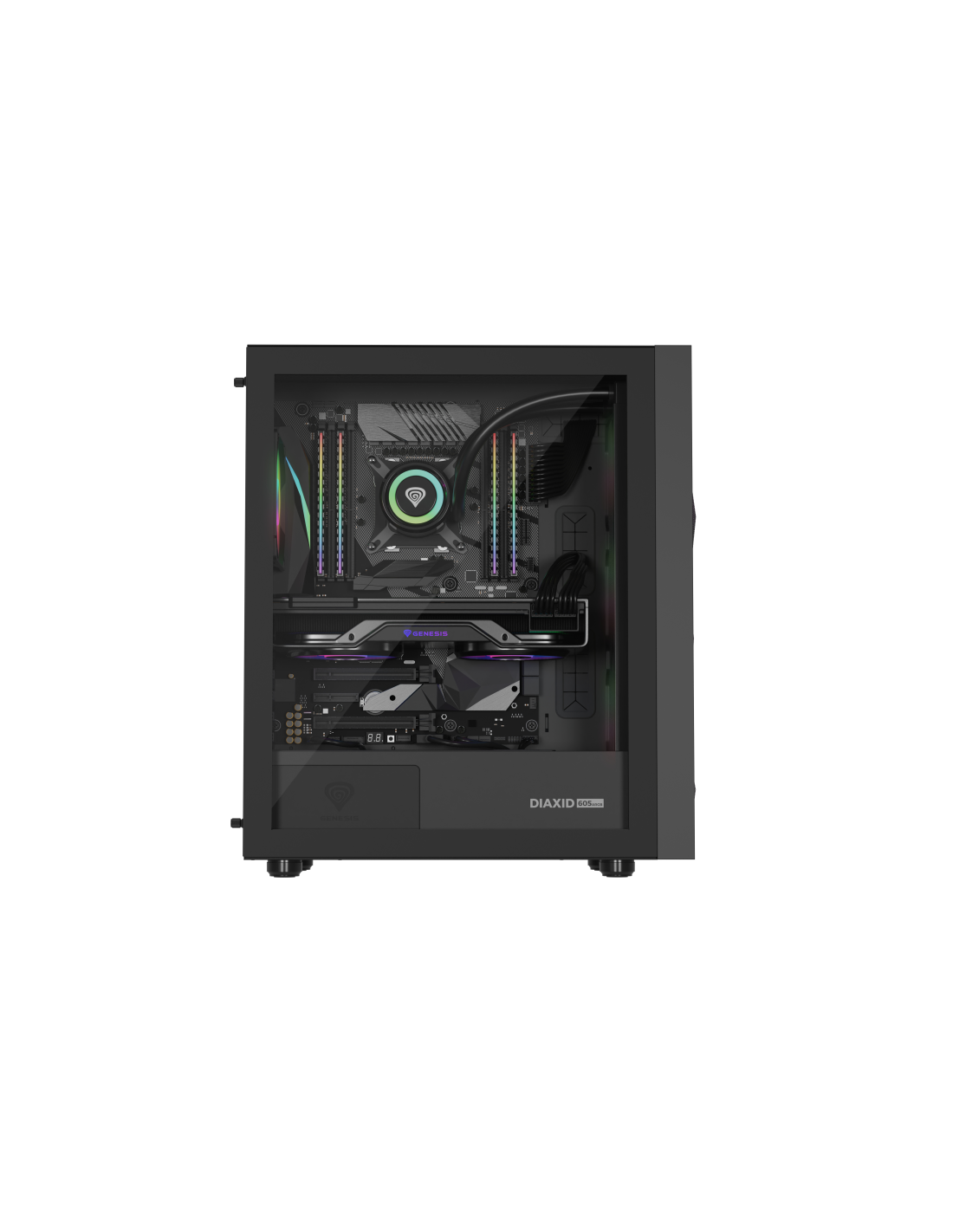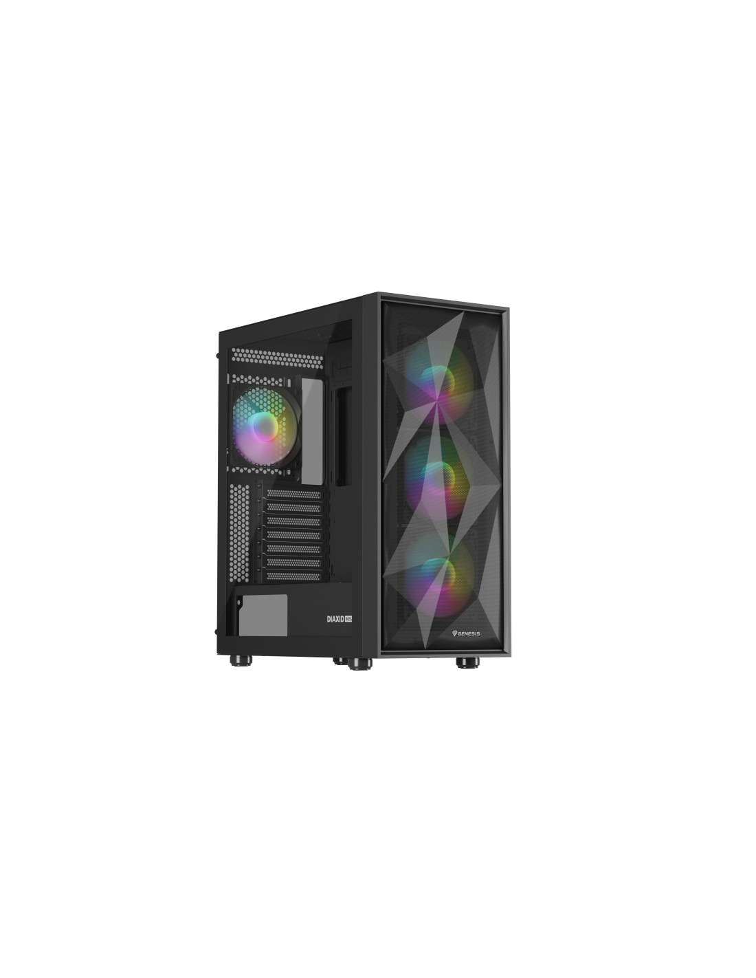 GENESIS Diaxid 605 ARGB. Factor de forma: Midi Tower, Tipo: PC, Color del producto: Negro. Ubicación de fuente de alimentación: Fondo, Factores de forma de la fuente de alimentación compatibles: ATX. Ventiladores frontales instalados: 3x 120 mm, Diámetro de ventiladores frontales soportados: 120,140 mm, Ventiladores traseros instalados: 1x 120 mm. Tamaños de disco duro soportados: 2.5,3.5". Ancho: 217 mm, Profundidad: 420 mm, Altura: 466 mm