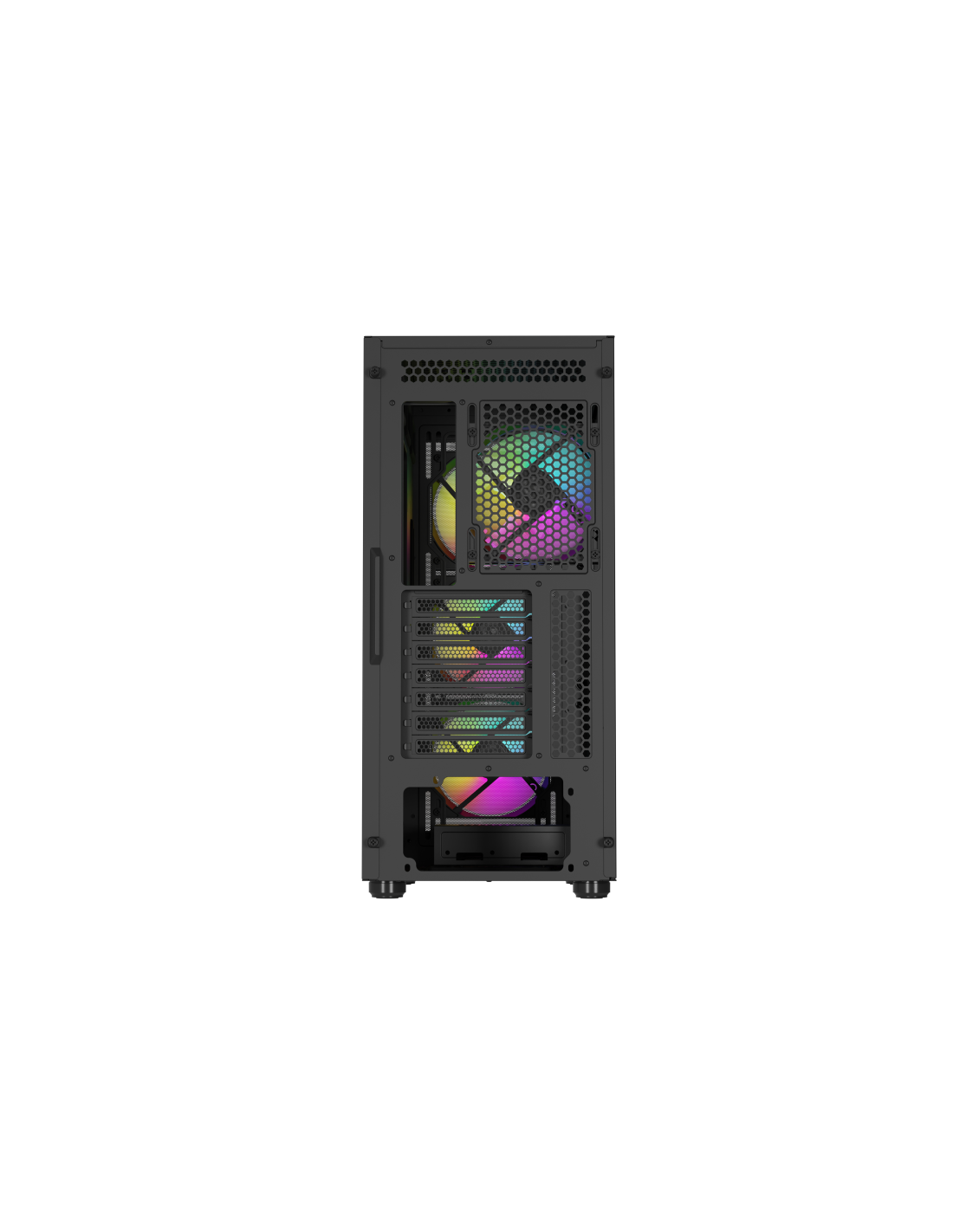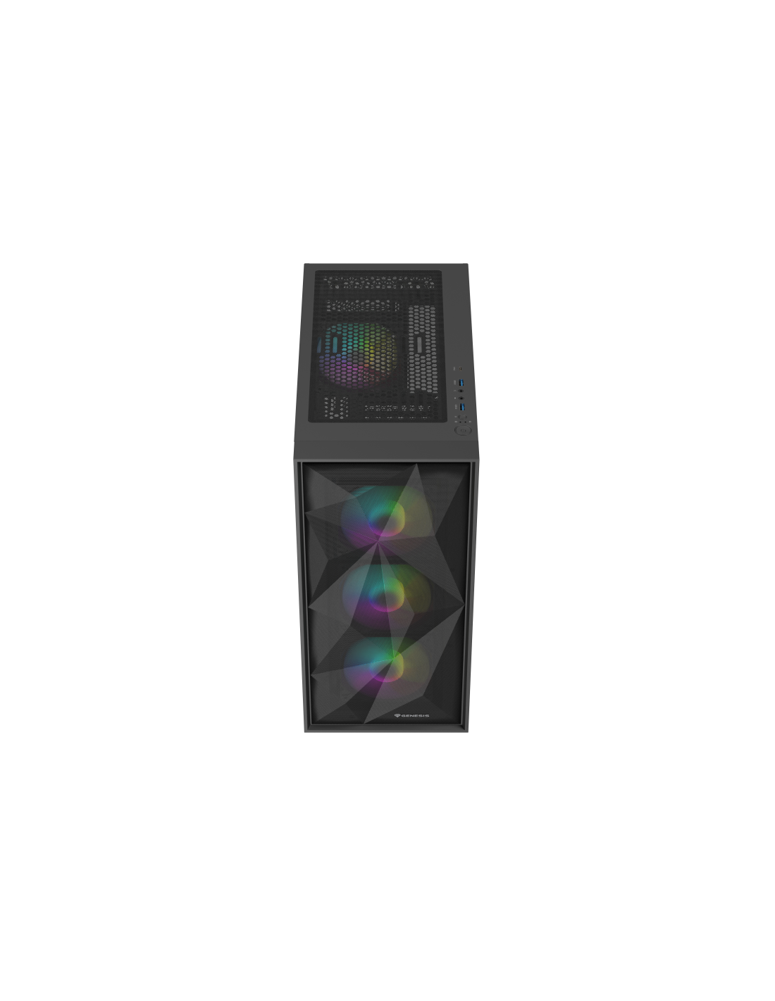 Saluda a hasta 4 ventiladores GENESIS Oxal 120 ARGB que ofrecen no sólo un alto rendimiento, sino también controlabilidad con la placa base. Además de su original diseño, también garantizarán silencio y temperaturas óptimas incluso en los días más calurosos. Hasta 3 de ellos (bombeando aire al interior) encontrarás en la parte frontal, mientras que el restante (extrayendo) en la trasera. Gracias a esta configuración, puedes contar con una presión positiva en el interior de la carcasa, que, combinada con un filtrado completo, protege aún mejor contra el polvo. ¿No es suficiente? 2 espacios adicionales en la parte superior e inferior de la caja te permitirán ampliar fácilmente la unidad como desees (incluido el montaje de hasta 3 ventiladores de 140 mm en la parte frontal).