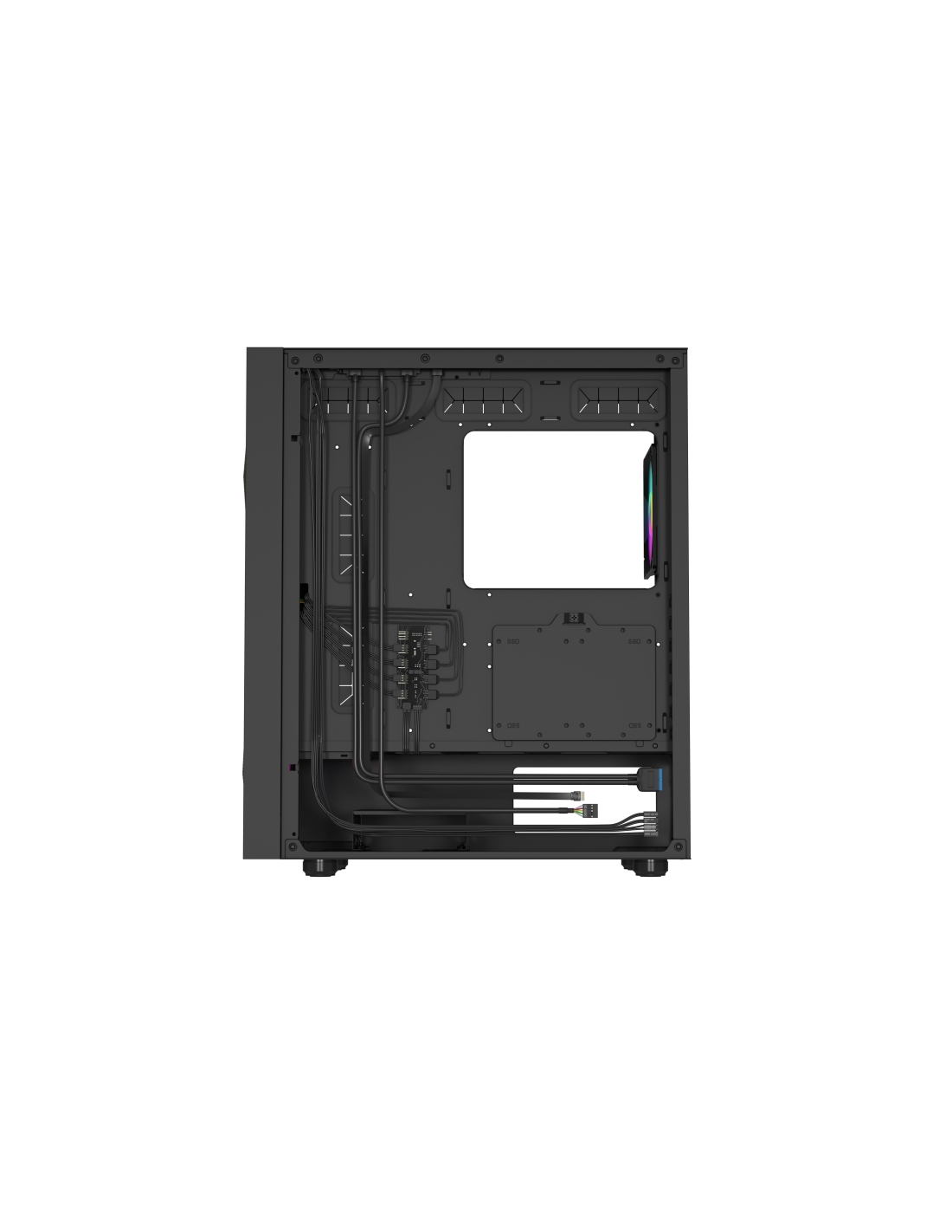 ¿Utilizas puertos USB y te importa la funcionalidad? Es un gran negocio. En la parte superior del GENESIS Diaxid 605 ARGB encontrarás no sólo un moderno puerto USB-C (Gen 2 hasta 10 Gbit/s), sino también 2 × USB Tipo A (3.2 Gen 1). También podrás conectar sin esfuerzo un kit de audio con una entrada independiente para audio y micrófono (2 × 3,5 mm). Numerosos ojales, un sótano y rejillas de goma son los elementos que hacen que el GENESIS Diaxid 605 ARGB sea funcional por dentro. Nunca ha sido tan fácil instalar componentes de forma cuidadosa y estética.