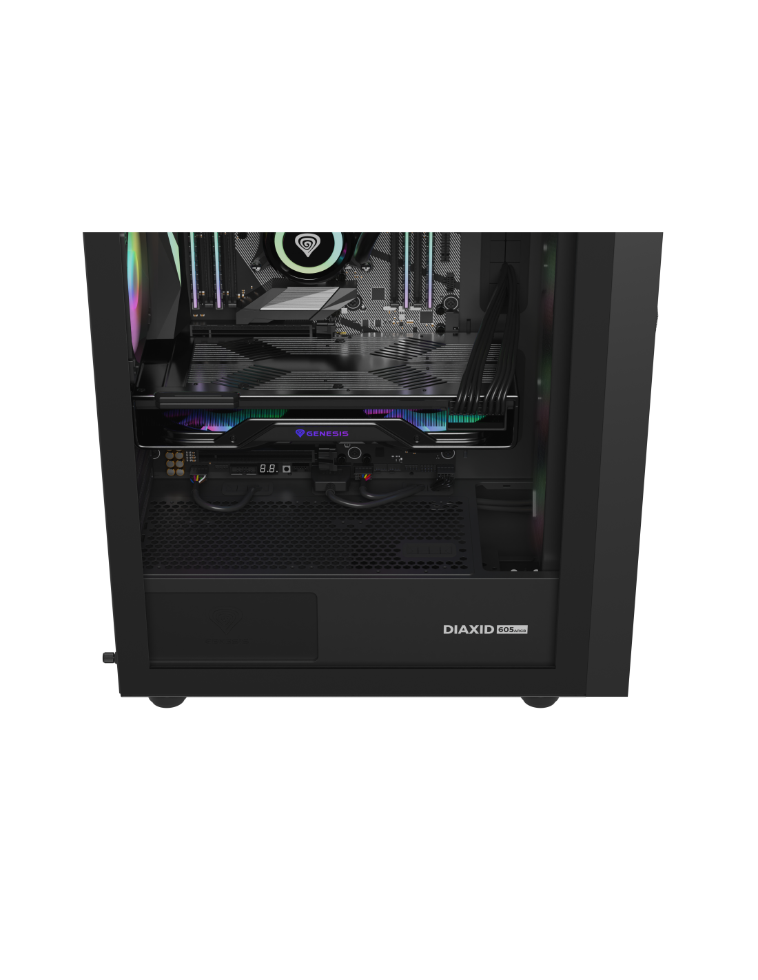 GENESIS Diaxid 605 ARGB es un modelo que hemos creado pensando en las posibilidades de construir unidades de alto rendimiento. Esto significa no sólo excelentes propiedades de refrigeración, sino también la posibilidad de montar componentes de forma totalmente considerada. Compatibilidad con placas ATX, microATX, mini-ITX, 2 ranuras para soportes SSD de 2,5", 1 ranura para HDD de 3,5" y 1 ranura híbrida 2,5"/3,5". Además de tarjetas gráficas con una longitud máxima de ~351 mm y torres de refrigeración con una altura de ~168 mm. Apuesta por una carcasa que cumpla tus expectativas.