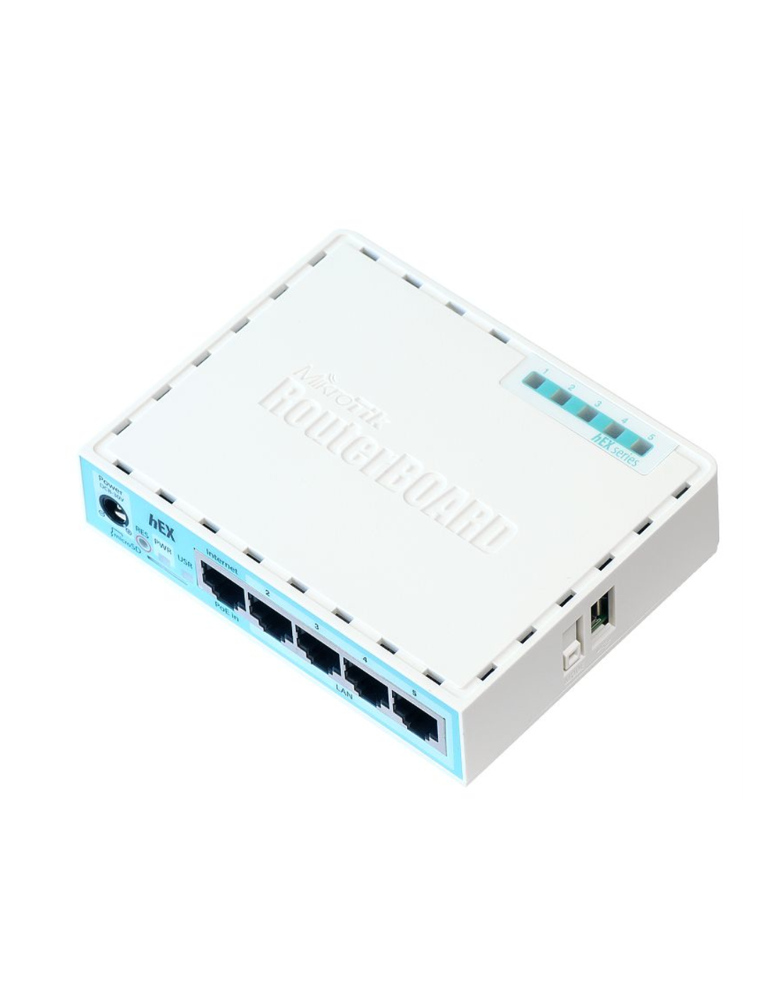 Mikrotik RB750GR3. Tipo de interfaz ethernet: Gigabit Ethernet, Tecnología de cableado: 10/100/1000Base-T(X), Ethernet LAN, velocidad de transferencia de datos: 10,100,1000 Mbit/s. Arquitectura del procesador: MIPS64, Frecuencia del procesador: 880 MHz, Capacidad de almacenamiento interno: 0,16 GB. Color del producto: Turquesa, Blanco, Indicadores LED: Poder. Alimentación: CC, Corriente de entrada: 8 - 30 A. Ancho: 113 mm, Profundidad: 89 mm, Altura: 28 mm
