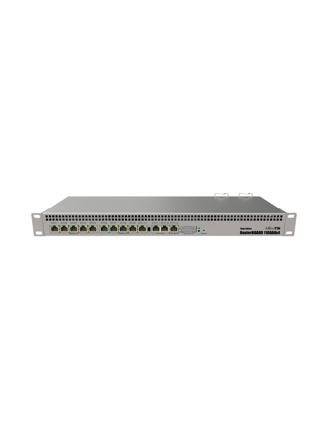 Mikrotik 1100Dx4 DudeEdition. Estándares de red: IEEE 802.3af, IEEE 802.3at, Ethernet LAN, velocidad de transferencia de datos: 10,100,1000 Mbit/s. Algoritmos de seguridad soportados: 128-bit AES. Frecuencia del procesador: 1400 MHz, Memoria interna: 1024 MB, Tarjetas de memoria compatibles: MicroSD (TransFlash). Color del producto: Aluminio, Capacidad del rack: 1U. Alimentación: CC