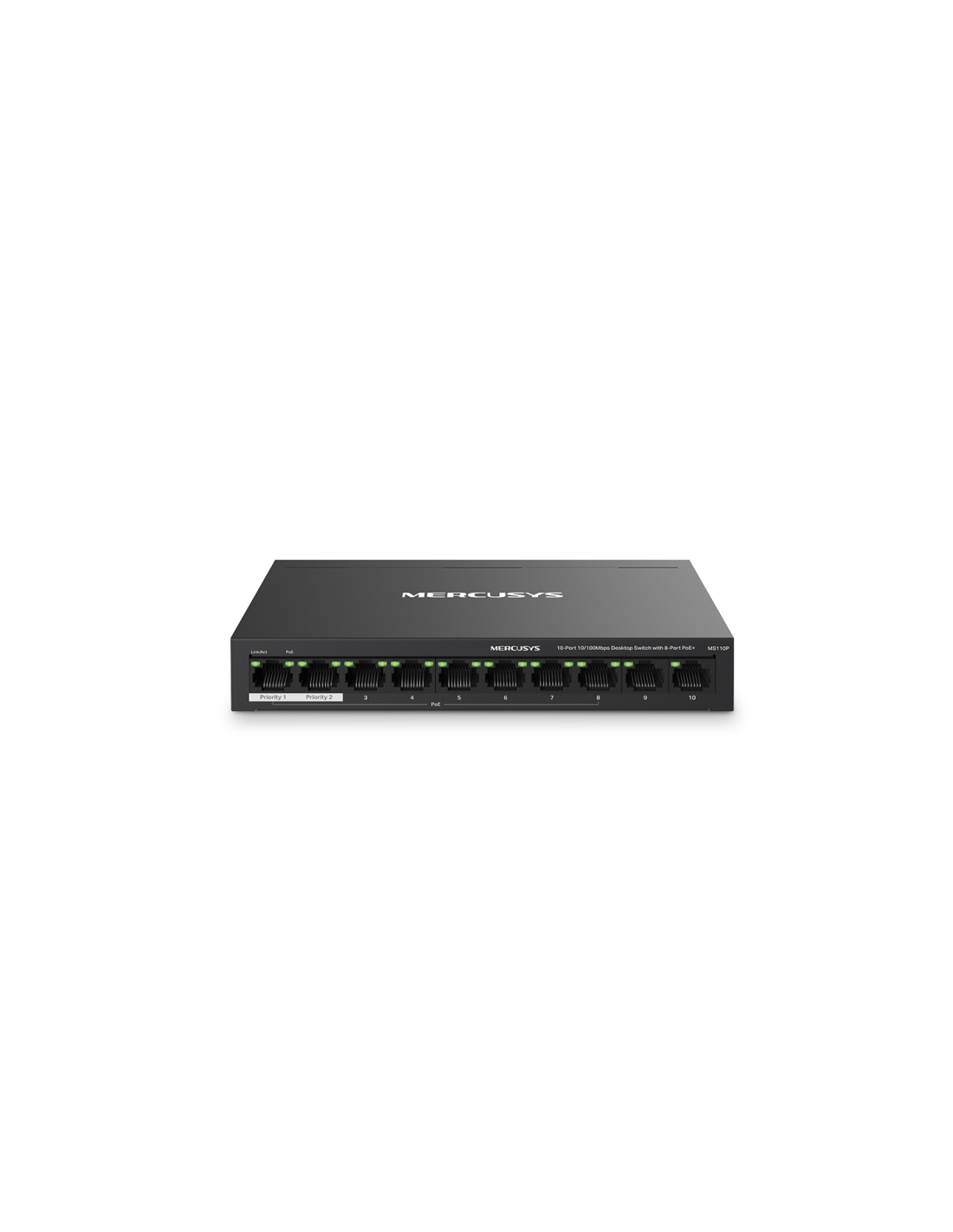 Mercusys MS110P. Tipo de interruptor: Gestionado. Puertos tipo básico de conmutación RJ-45 Ethernet: Fast Ethernet (10/100), Cantidad de puertos básicos de conmutación RJ-45 Ethernet: 10. Bidireccional completo (Full duplex). Tabla de direcciones MAC: 2000 entradas. Estándares de red: IEEE 802.3af, IEEE 802.3at, IEEE 802.3x. Voltaje de entrada DC: 53.5 V. Energía sobre Ethernet (PoE). Montaje de pared