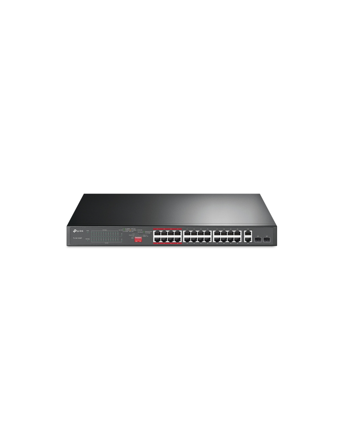 TP-Link TL-SL1226P. Tipo de interruptor: No administrado. Puertos tipo básico de conmutación RJ-45 Ethernet: Gigabit Ethernet (10/100/1000), Cantidad de puertos básicos de conmutación RJ-45 Ethernet: 26. Tabla de direcciones MAC: 8000 entradas, Capacidad de conmutación: 8,8 Gbit/s. Estándares de red: IEEE 802.3af, IEEE 802.3at, IEEE 802.3x. Energía sobre Ethernet (PoE). Montaje en rack, Factor de forma: 1U