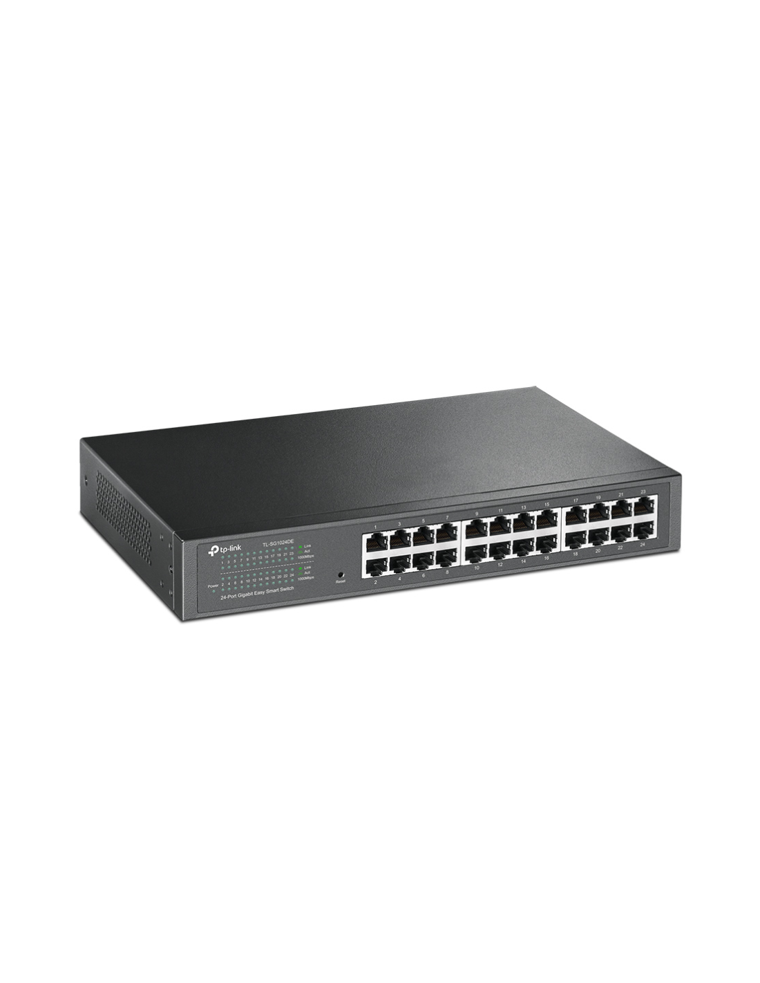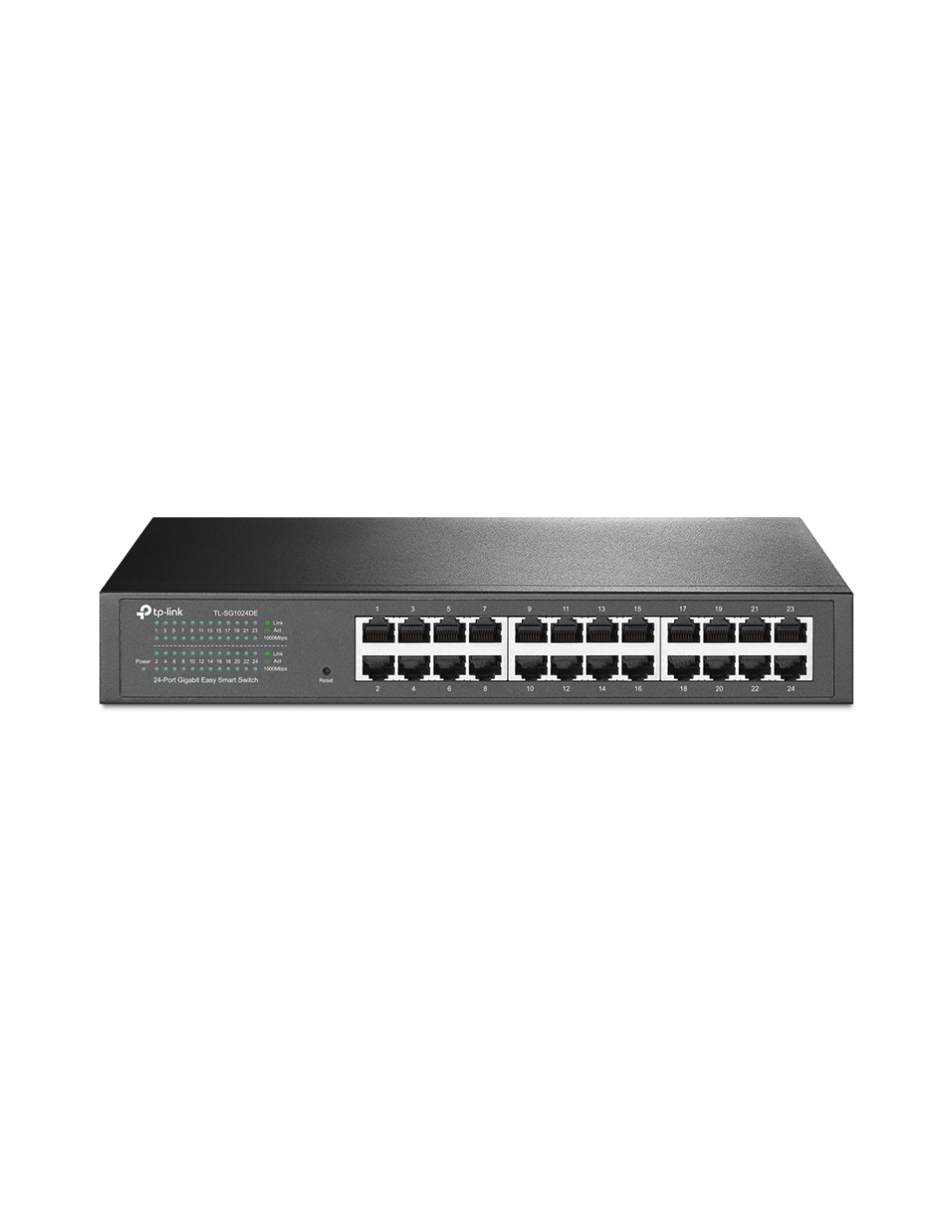 TP-Link TL-SG1024DE. Tipo de interruptor: Gestionado, Capa del interruptor: L2. Puertos tipo básico de conmutación RJ-45 Ethernet: Gigabit Ethernet (10/100/1000), Cantidad de puertos básicos de conmutación RJ-45 Ethernet: 24. Tabla de direcciones MAC: 8000 entradas, Capacidad de conmutación: 48 Gbit/s. Estándares de red: IEEE 802.1Q, IEEE 802.1p, IEEE 802.3, IEEE 802.3ab, IEEE 802.3u, IEEE 802.3x. Montaje en rack, Factor de forma: 1U