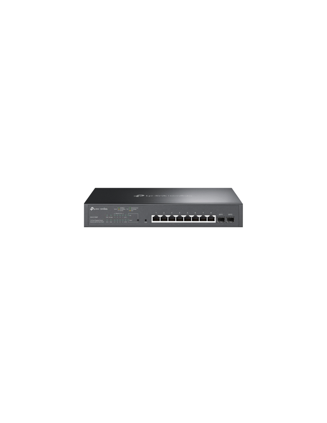 TP-Link Omada TL-SG2210MP. Tipo de interruptor: Gestionado, Capa del interruptor: L2/L2+. Puertos tipo básico de conmutación RJ-45 Ethernet: Gigabit Ethernet (10/100/1000), Cantidad de puertos básicos de conmutación RJ-45 Ethernet: 8. Tabla de direcciones MAC: 8000 entradas, Capacidad de conmutación: 20 Gbit/s. Estándares de red: IEEE 802.1D, IEEE 802.1Q, IEEE 802.1p, IEEE 802.1s, IEEE 802.1w, IEEE 802.1x, IEEE 802.3ab, IEEE.... Energía sobre Ethernet (PoE). Montaje en rack, Factor de forma: 1U