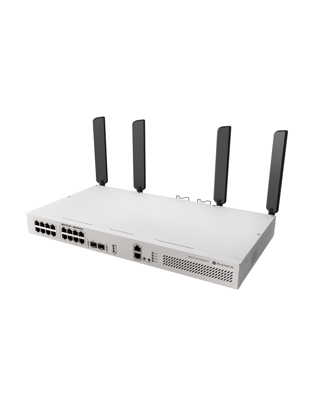 Mikrotik CRS418-8P-8G-2S+5axQ2axQ-RM. Capa del interruptor: L2/L3. Puertos tipo básico de conmutación RJ-45 Ethernet: Gigabit Ethernet (10/100/1000), Cantidad de puertos básicos de conmutación RJ-45 Ethernet: 17, Puerto de consola: RJ-45. Estándares de red: IEEE 802.3af, IEEE 802.3at. Energía sobre Ethernet (PoE). Montaje en rack, Factor de forma: 1U