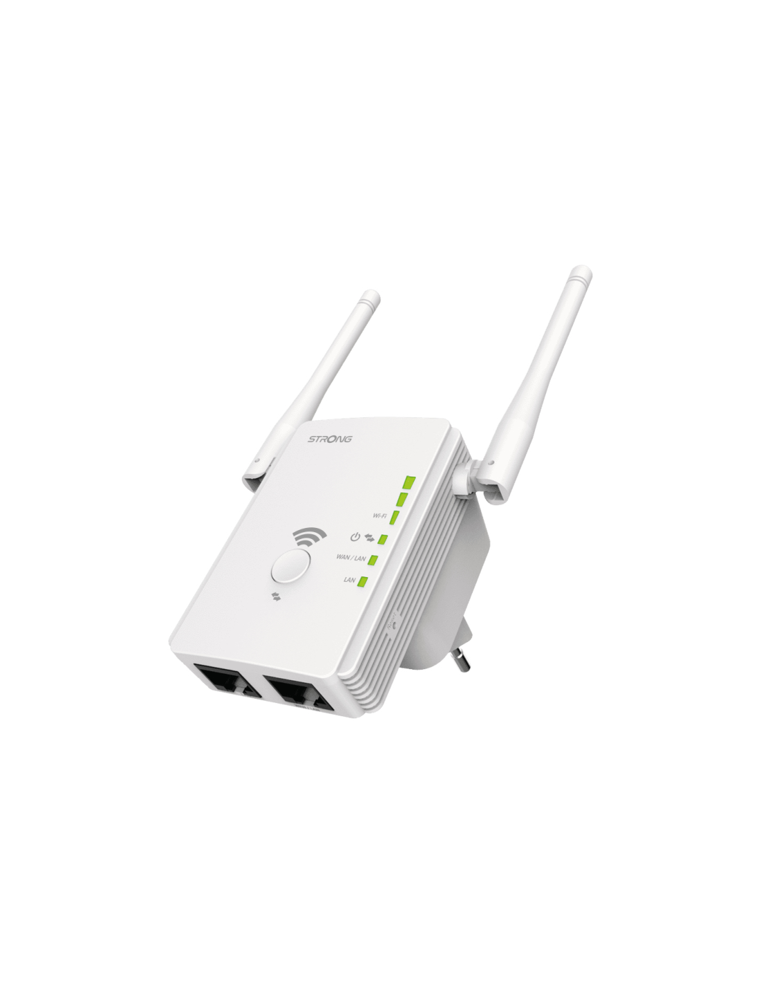 Strong REPEATER300V2. Rango máximo de transferencia de datos: 300 Mbit/s. Diseño de la antena: Externo, Ganancia de la antena (max): 3 dBi. Banda Wi-Fi: Banda única (2,4 GHz), Estándar Wi-Fi: Wi-Fi 4 (802.11n), Tasa de transferencia de datos WLAN (máx.): 300 Mbit/s. Tipo de interfaz Ethernet LAN: Ethernet rápido, Ethernet LAN, velocidad de transferencia de datos: 10,100 Mbit/s, Estándares de red: IEEE 802.11b, IEEE 802.11g, IEEE 802.11n, IEEE 802.3, IEEE 802.3u. Tecnología de conectividad: Inalámbrico y alá