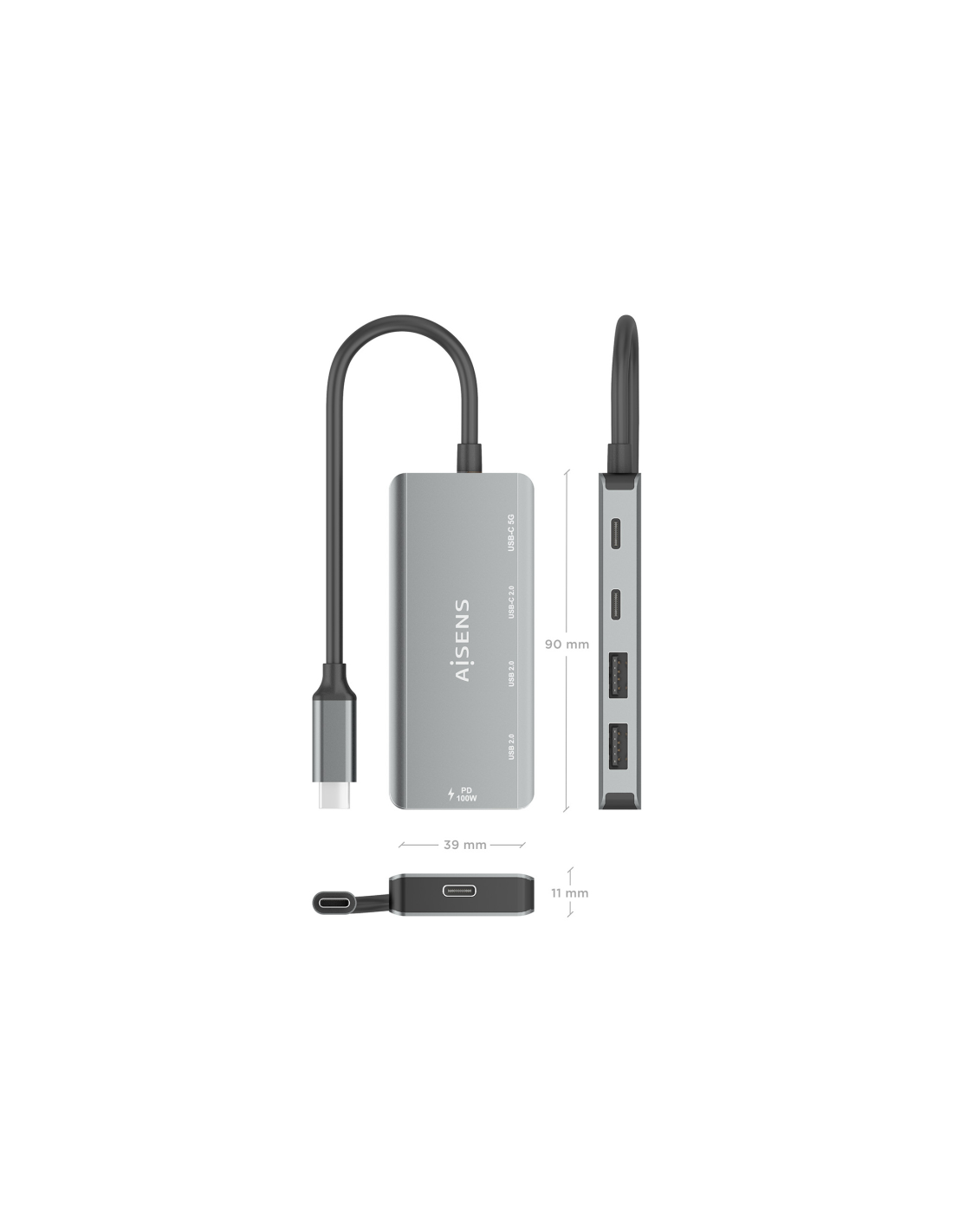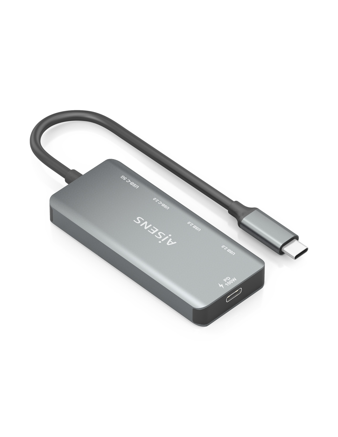 AISENS Hub USB 3.1 USB-C, USB-C/M-1xUSB-C PD 100W+1xUSB-C USB3.0/H+1xUSB-C USB2.0/H+2xUSB-A USB2.0/H, Gris, 15cm. Tecnología de conectividad: Alámbrico, Interfaz de host: USB 3.2 Gen 1 (3.1 Gen 1) Type-C, Entrega de energía USB (USB Power Delivery) de hasta: 100 W. Color del producto: Gris, Velocidad de transferencia de datos: 5 Gbit/s, Material de la carcasa: Aluminio. Alimentación: USB, Conector eléctrico: USB Tipo C, Longitud del cable USB: 0,15 m. Ancho: 39 mm, Profundidad: 90 mm, Altura: 11 mm. Cantida