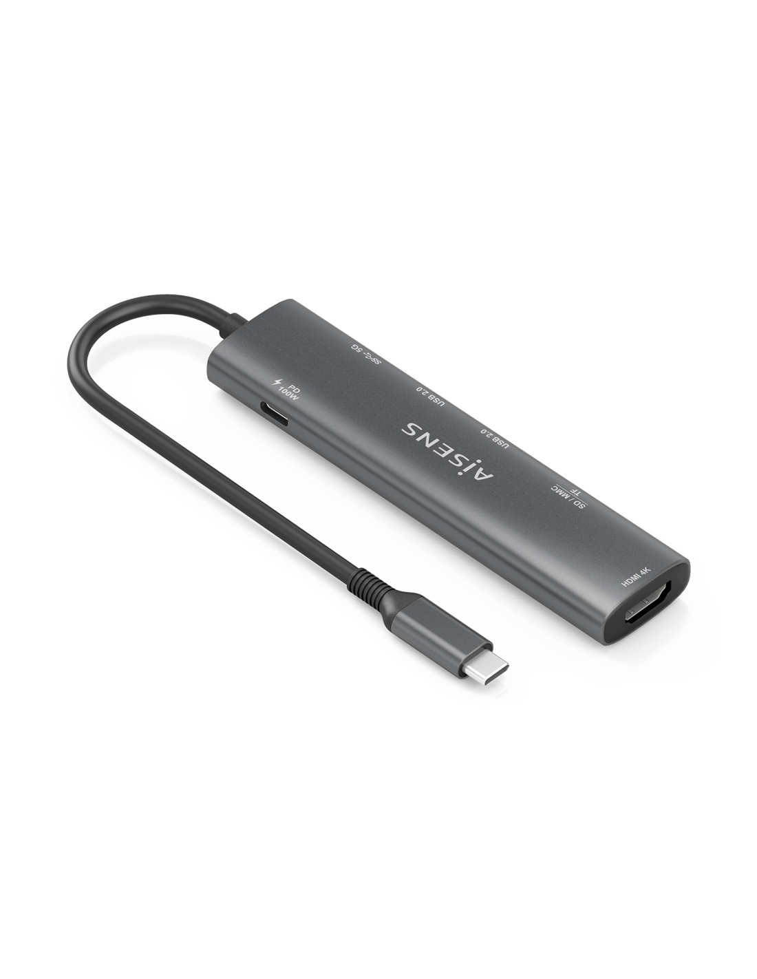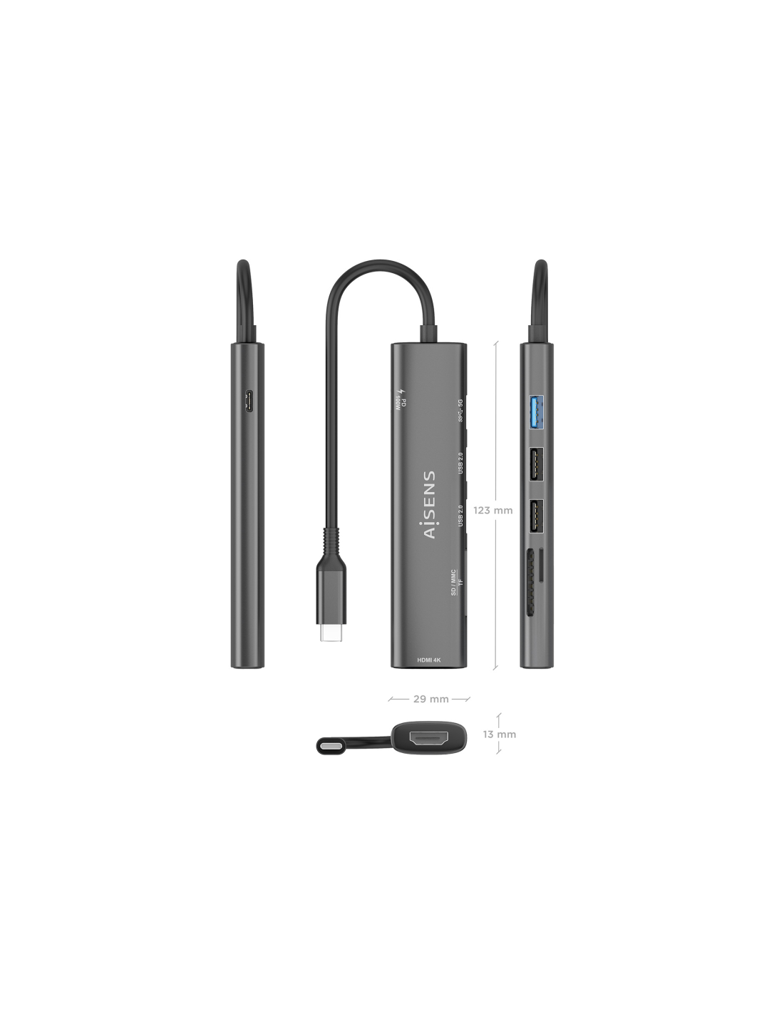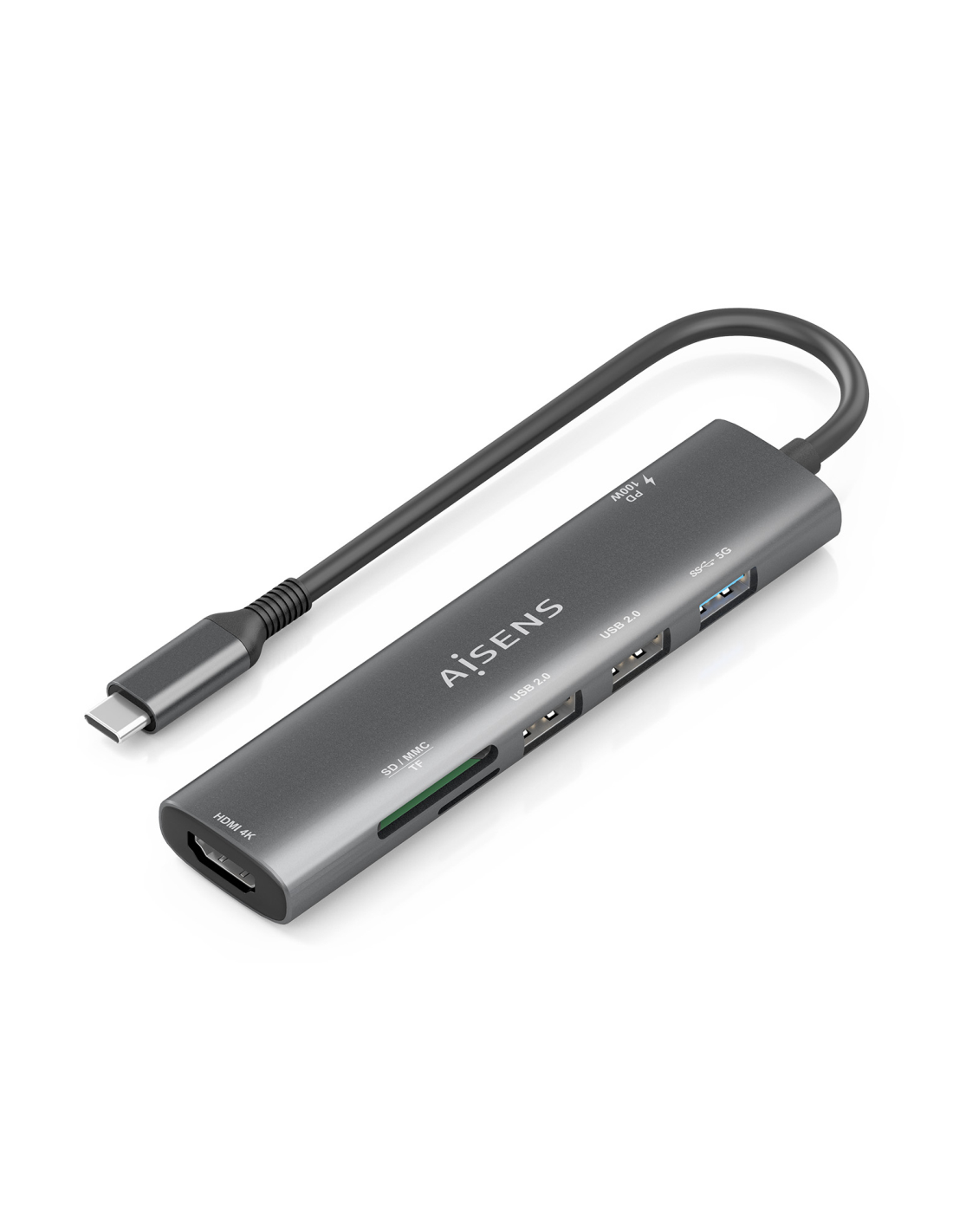AISENS USB-C Dock 7 en 1, USB-C A, 1x HDMI, 2x USB-A USB2.0, 1x USB-A USB3.0, 1x USB-C PD 100W, 1x SD, 1x MicroSD, Gris, 15cm