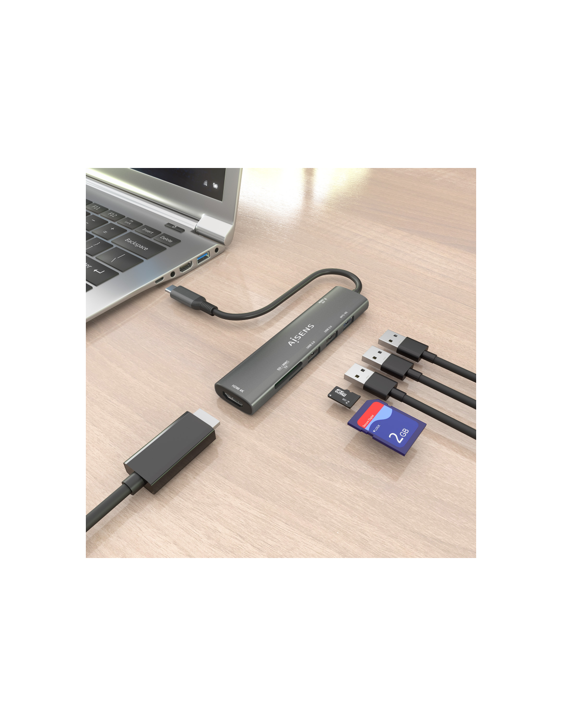 > Conversor USB-C a 1xHDMI, 2xUSB-A USB2.0, 1xUSB-A USB3.0, 1xUSB-C PD 100W, 1xLector de tarjeta SD, 1xLector de tarjeta MICRO SD