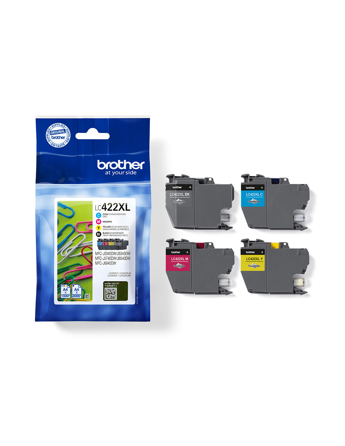 Pack de cartuchos XL originales LC422XLVAL, compuesto por un cartucho negro de 3.000 páginas (ISO/IEC 24711) y 3 cartuchos de color -cian, magenta y amarillo- de 1.500 páginas (ISO/IEC 24711), está pensado para usuarios que buscan un coste de impresión más reducido y una mayor autonomía y comodidad entre reemplazos. Ahorro en cada página impresa.