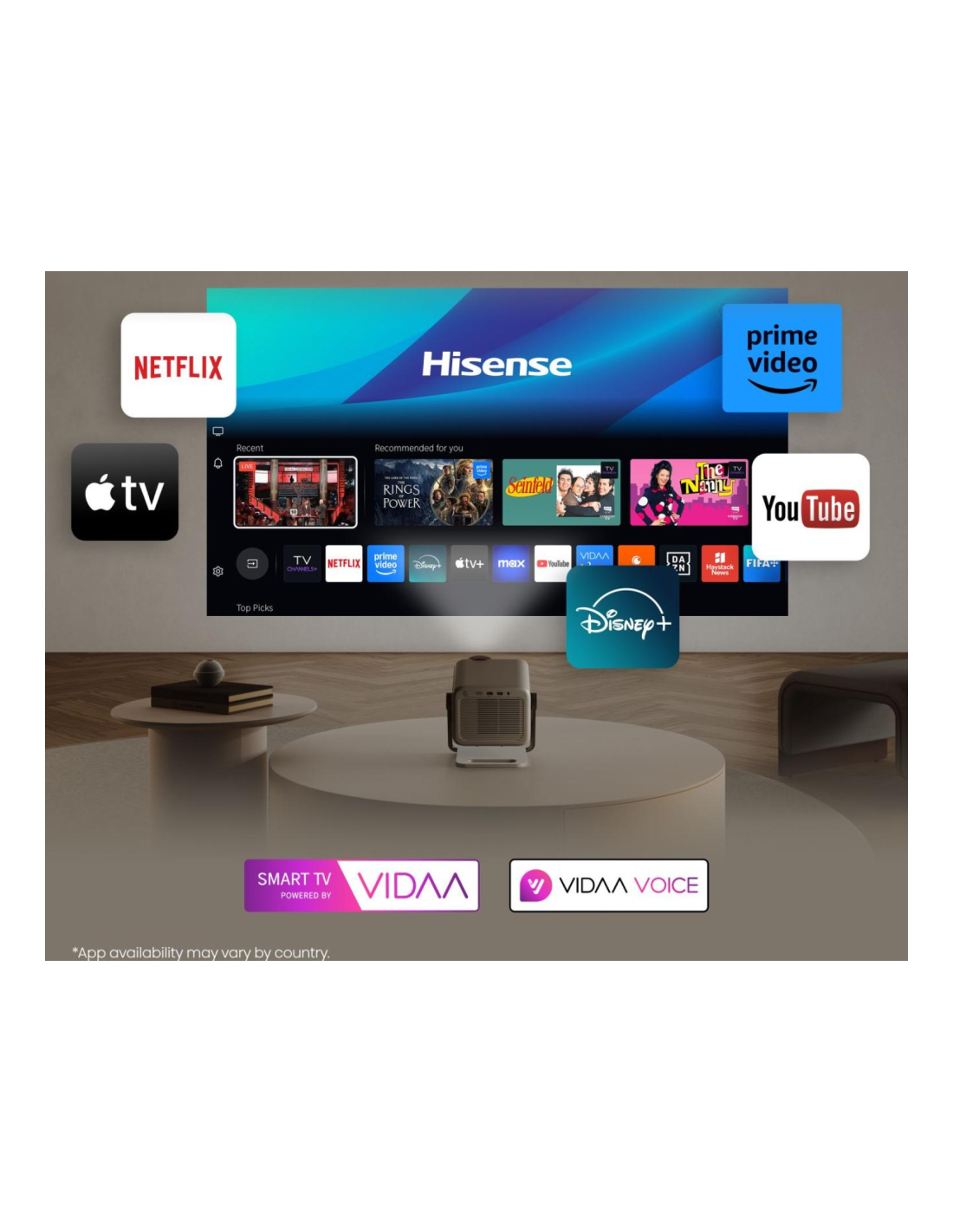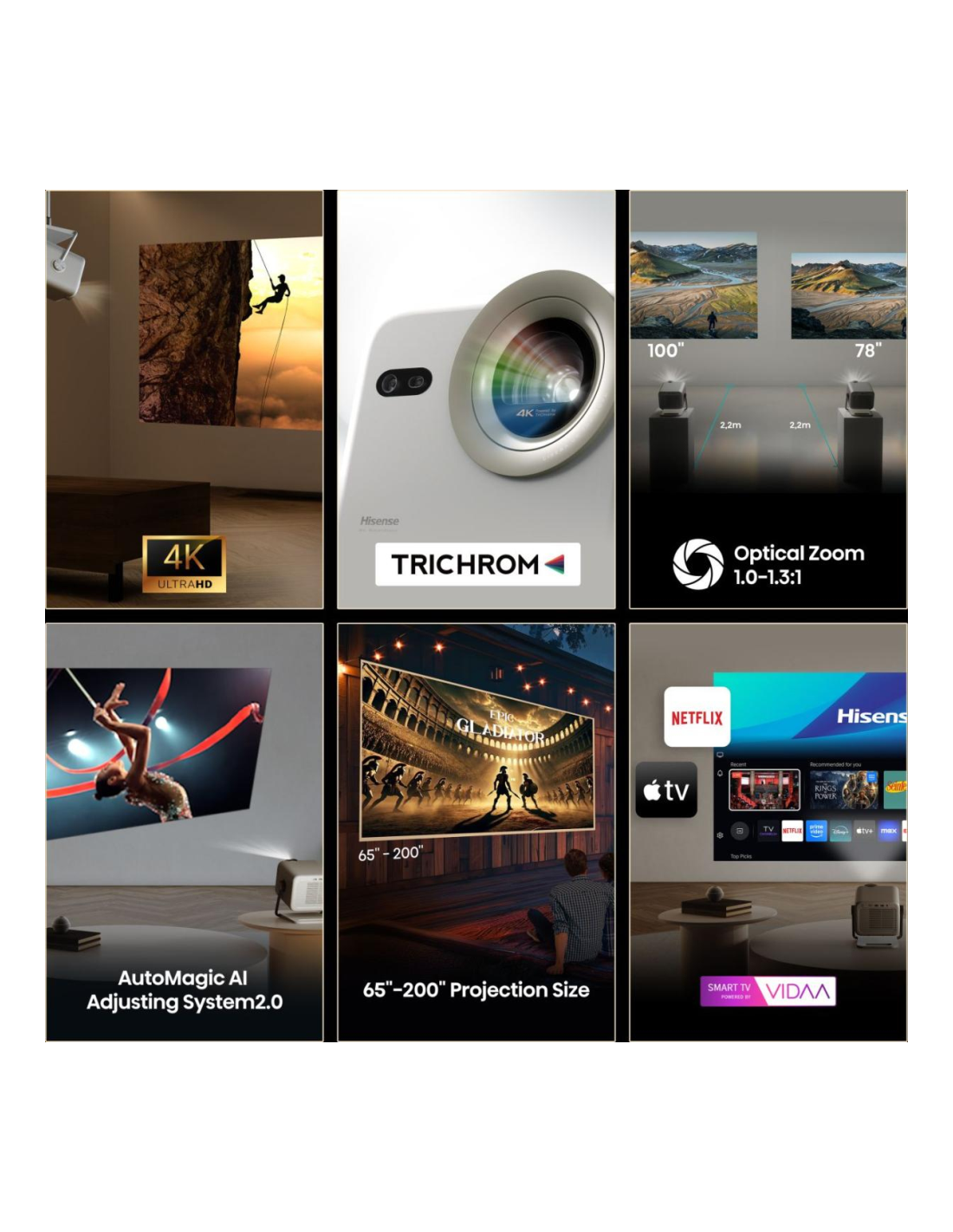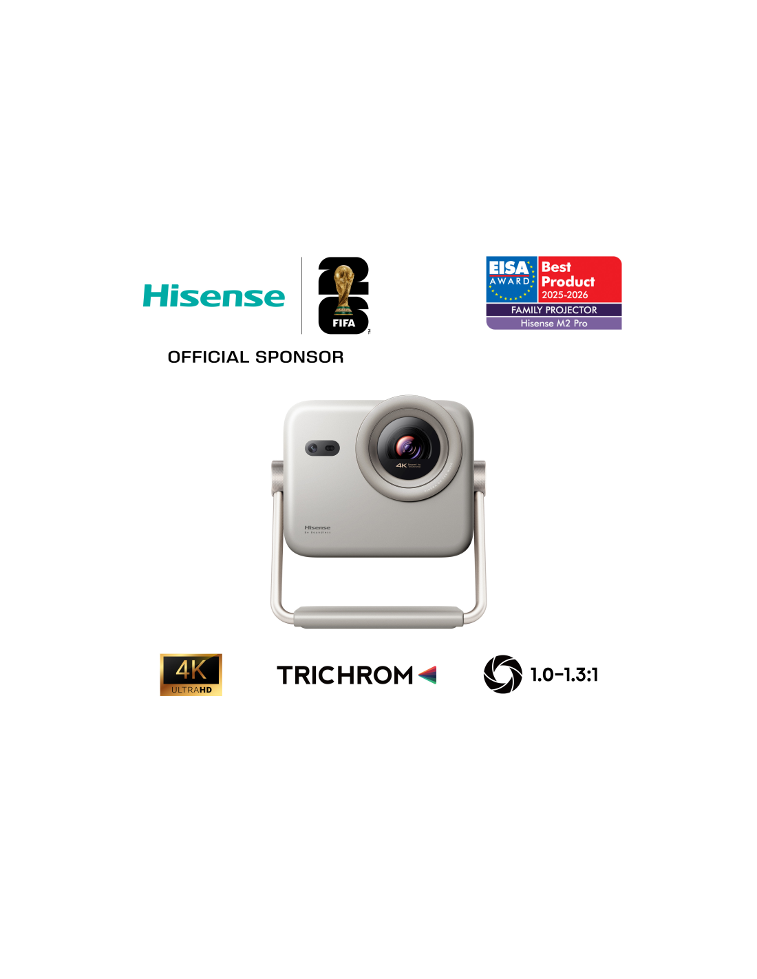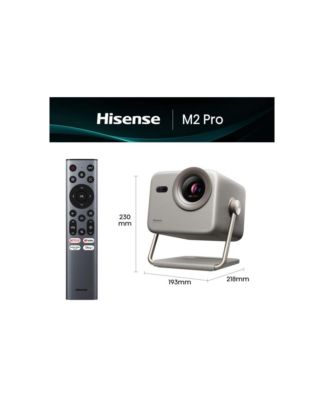 Hisense M2 Pro. Resolución original del proyector: UHD 4K (3840x2160), Razón de contraste (típica): 1000:1, Relación de aspecto nativa: 16:9. Alcance de zoom: 1.3:1. Tipo de serie de interfaz: RJ-45, Versión HDMI: 2.0/2.1. Wi-Fi estándares: 802.11a, 802.11b, 802.11g, Wi-Fi 4 (802.11n), Wi-Fi 5 (802.11ac). Tecnología HDR (High Dynamic Range, Alto rango dinámico): HDR 10+, High Dynamic Range 10 (HDR10), Hybrid Log-Gamma Pro (HLG Pro), Aplicaciones de vídeo: Amazon Prime Video, Disney+, Netflix, YouTube, Siste