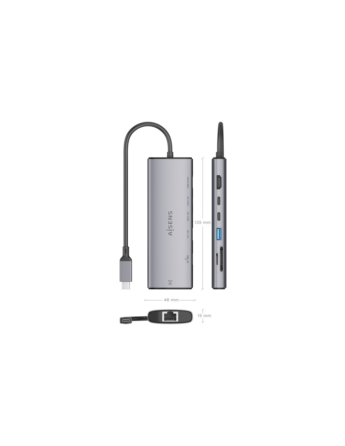 AISENS USB-C Dock 7 en 1, USB-C a 1xHDMI, 1xRJ45, 1xUSB-A 10G, 2xUSB-C 10G, 1xSD, 1xMicroSD, Gris, 20cm