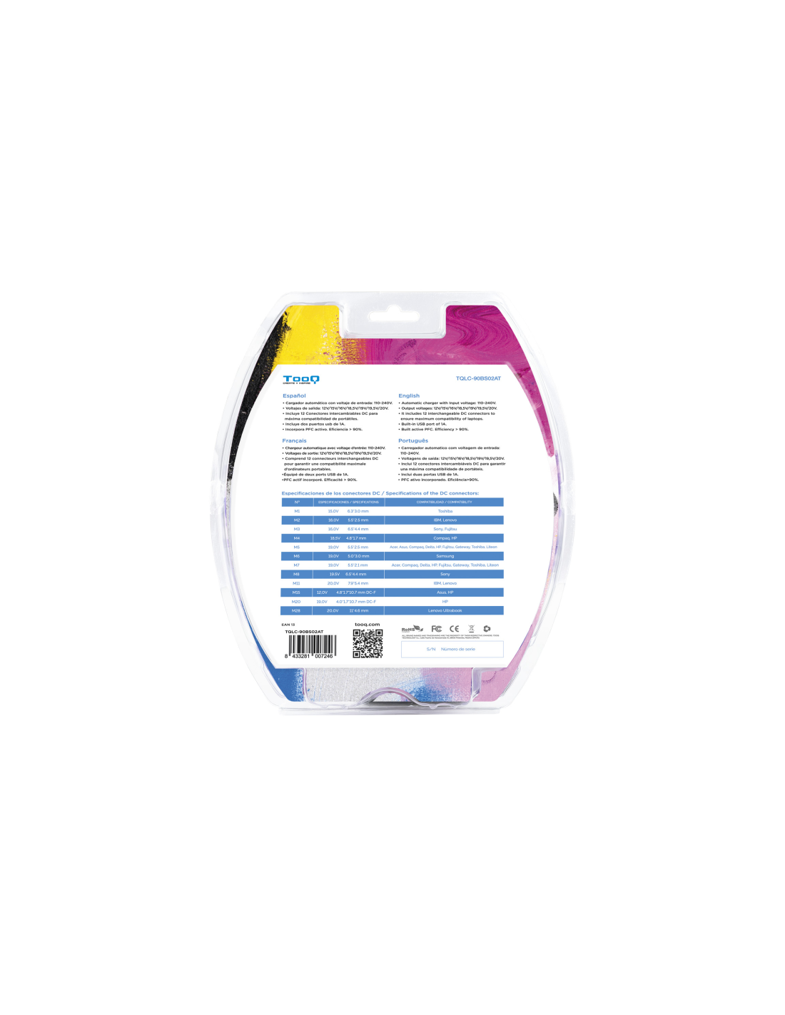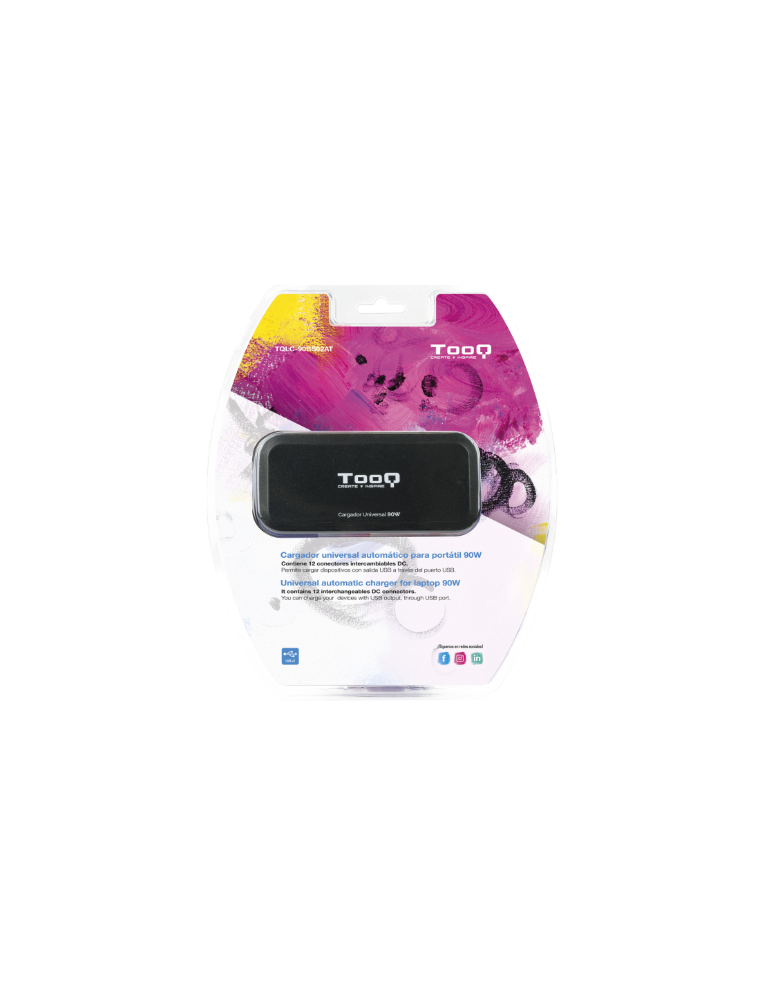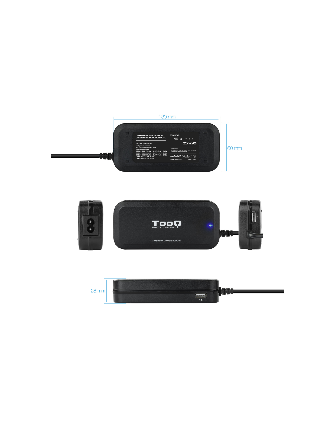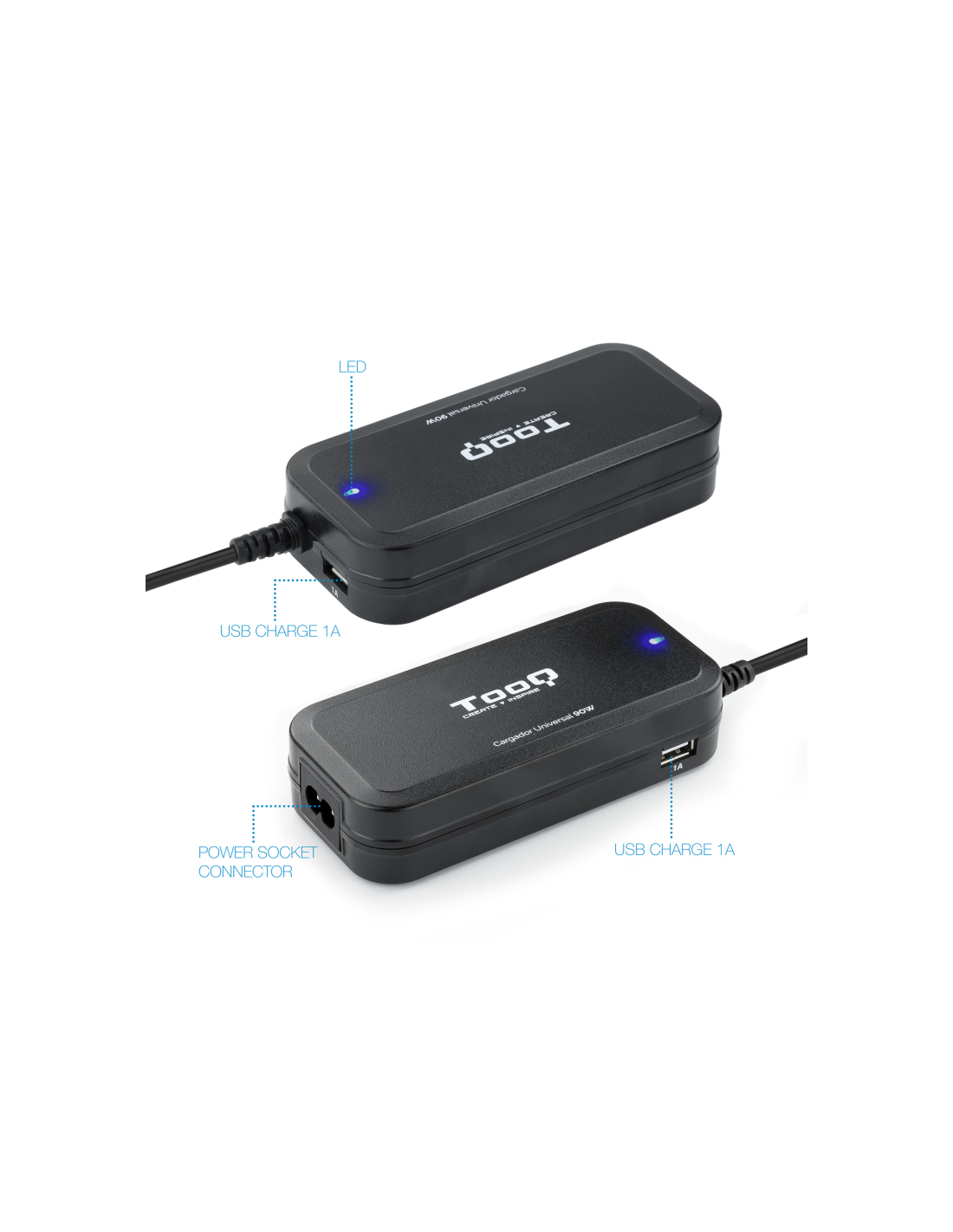 TooQ TQLC-90BS02AT. Utilizar con: Portátil, Tipo de fuente de alimentación: Interior, Voltaje de entrada: 100 - 240 V. Corriente de salida USB: 1 A, Voltaje de salida USB: 5 V, Tiempo medio entre fallos: 50000 h. Color del producto: Negro. Tipo de embalaje: Blister. Cantidad por paquete: 1 pieza(s)