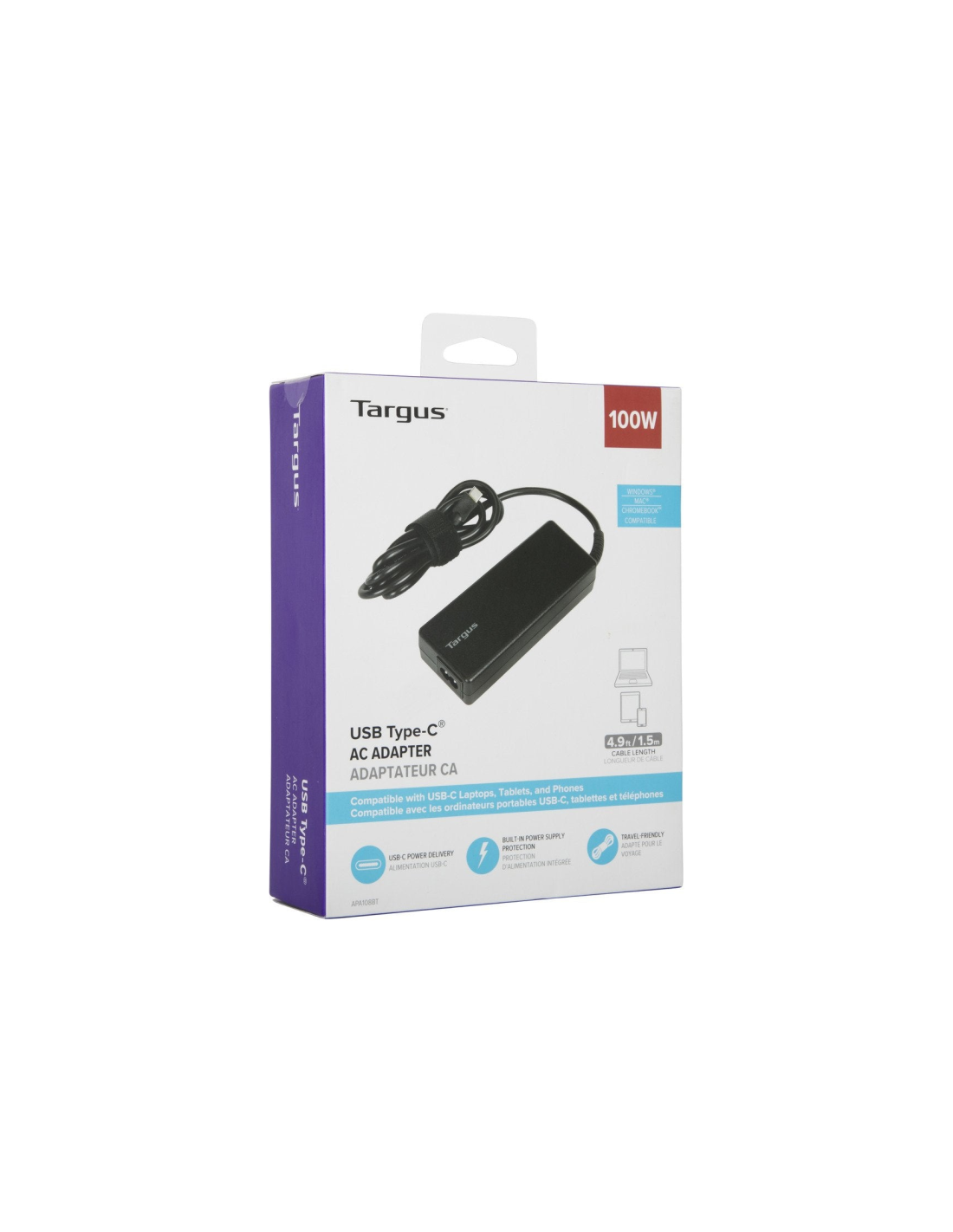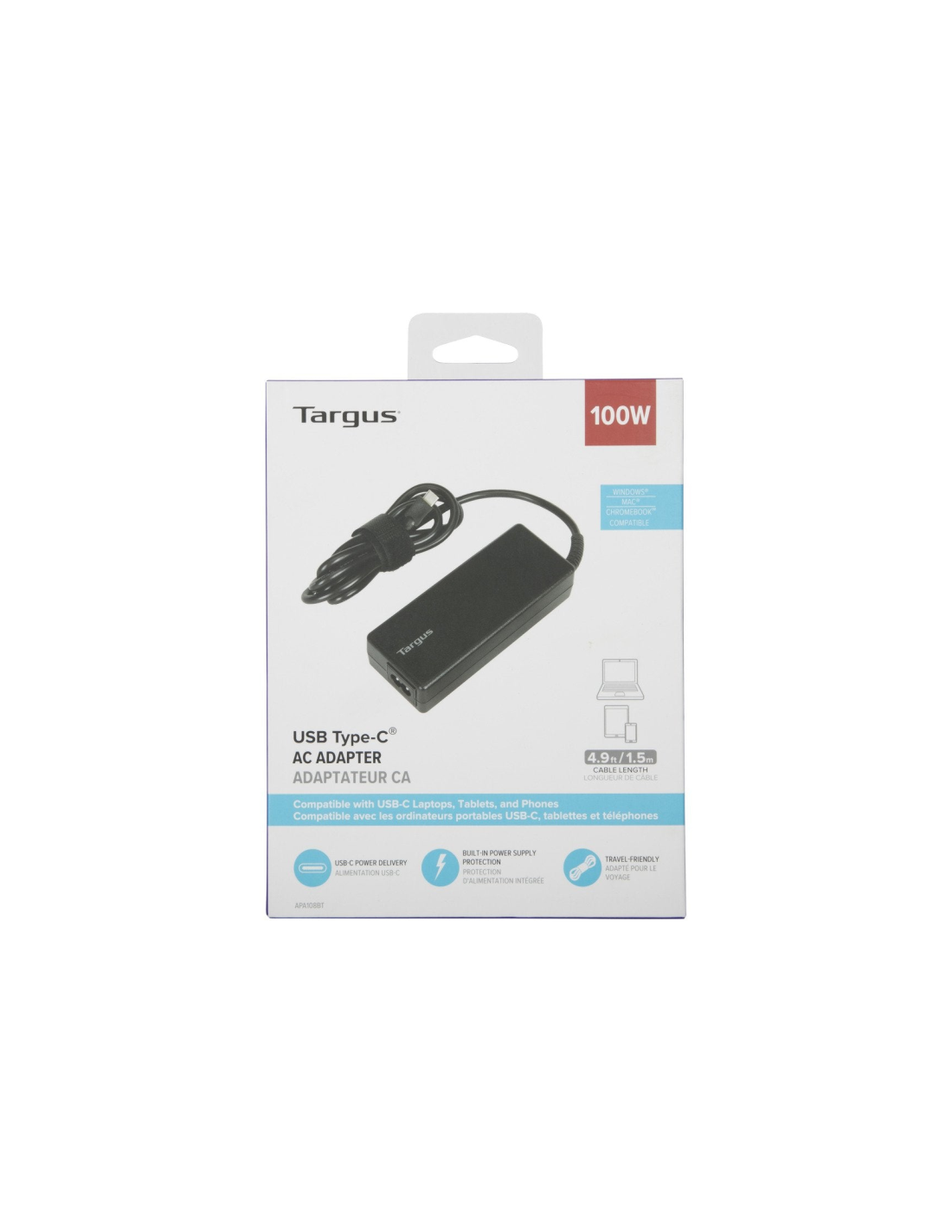 Targus APA108EU. Tipo de fuente de alimentación: Interior, Potencia de salida: 100 W, Tipo de corriente de poder: CA a CC. Color del producto: Negro. Longitud de cable: 1,5 m, Ancho: 192 mm, Profundidad: 170 mm. Cantidad por paquete: 1 pieza(s). País de origen: China