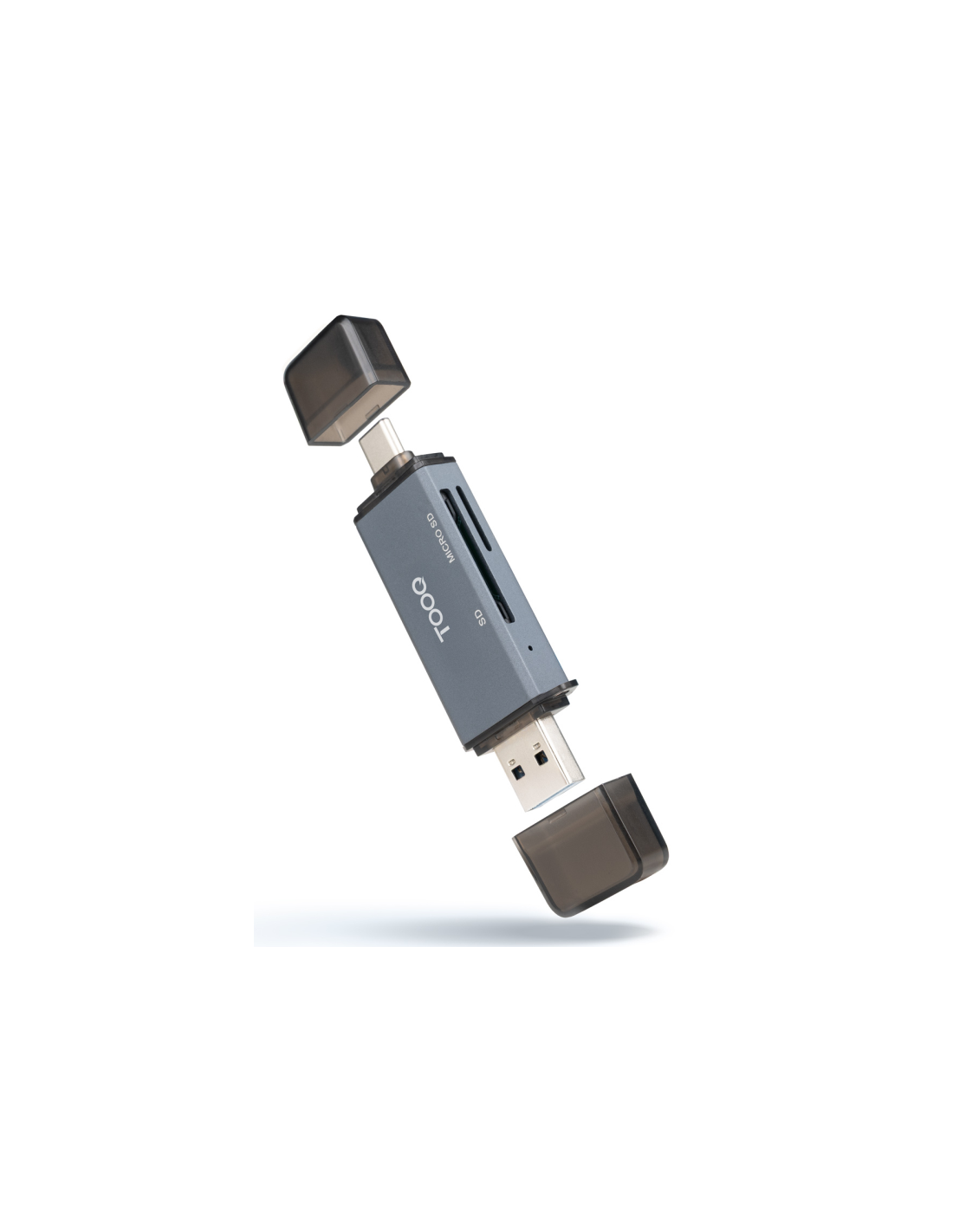 TooQ Lector de Tarjetas SD + TF, con entradas USB-C 3.0 + USB A, Color Gris. Tarjetas de memoria compatibles: MicroSD (TransFlash), SD, Color del producto: Gris, Material de la carcasa: Aluminio. Interfaz: USB 3.0 Type-A/Type-C. Ancho: 80 mm, Profundidad: 21 mm, Altura: 10 mm. Cantidad por paquete: 1 pieza(s), Ancho del paquete: 135 mm, Profundidad del paquete: 180 mm. Certificados de conformidad: CE, RoHS