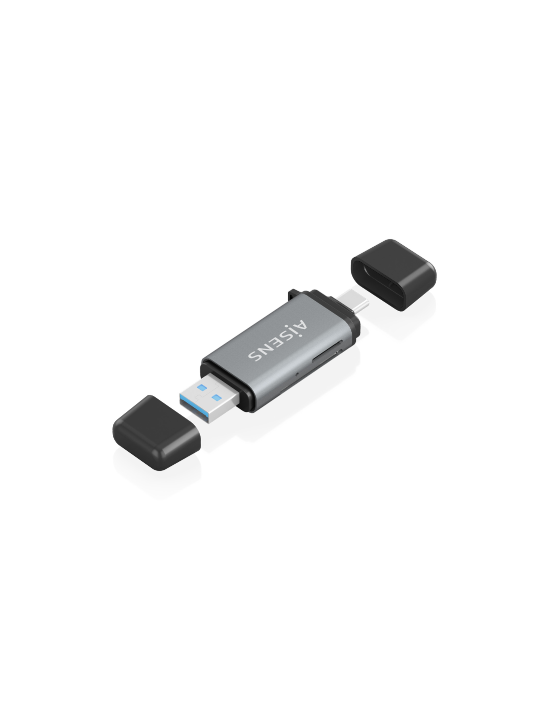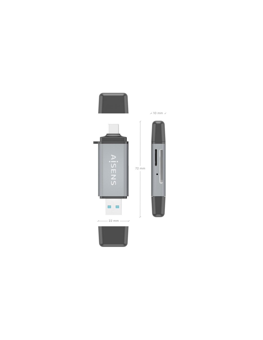 AISENS Lector De Tarjetas SD, Micro SD, MMC, Rs-MMC, MMC Micro, USB-A y USB-C, Gris. Tarjetas de memoria compatibles: MMC, MMCmicro, MicroSD (TransFlash), RS-MMC, Color del producto: Gris. Interfaz: USB 3.2 Gen 1 (3.1 Gen 1) Type-A/Type-C. Ancho: 22 mm, Profundidad: 72 mm, Altura: 10 mm. Cantidad por paquete: 1 pieza(s), Ancho del paquete: 70 mm, Profundidad del paquete: 130 mm. Sistema operativo Windows soportado: Windows 10, Windows 11, Windows 7, Windows 8