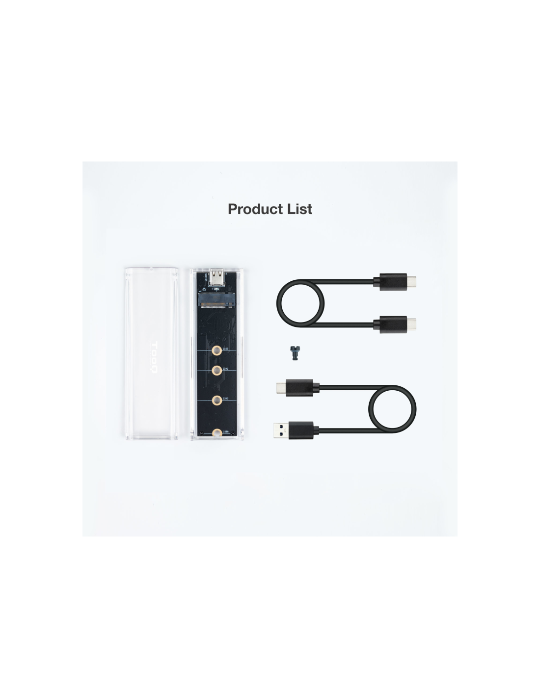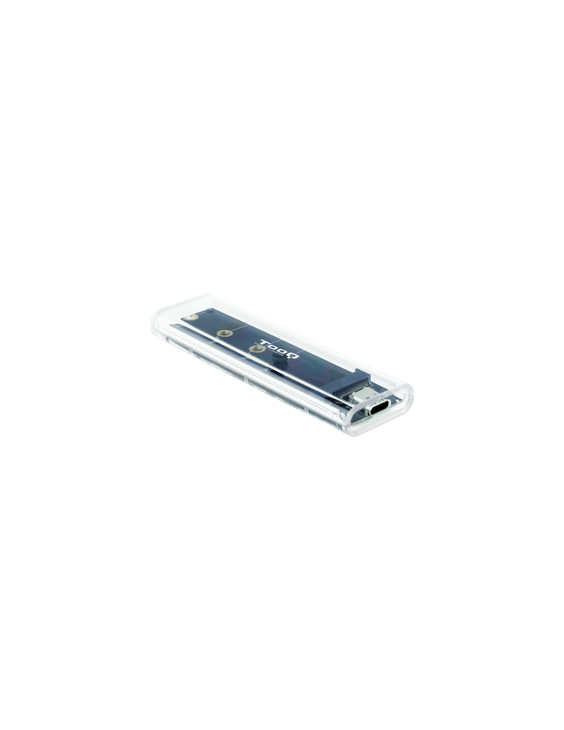 TooQ Caja Externa para SSD M.2 NGFF/NVMe, Transparente, RGB. Tipo de producto: Caja externa para unidad de estado sólido (SSD). Número de unidades de almacenamiento compatibles: 1, Tamaño de la unidad de almacenamiento: M.2, Interfaces de disco de almacenamiento soportados: PCI Express, Capacidad máxima de almacenaje: 2 TB. Velocidad de transferencia de datos: 10 Gbit/s. Color del producto: Transparente. Conector USB: USB Tipo C
