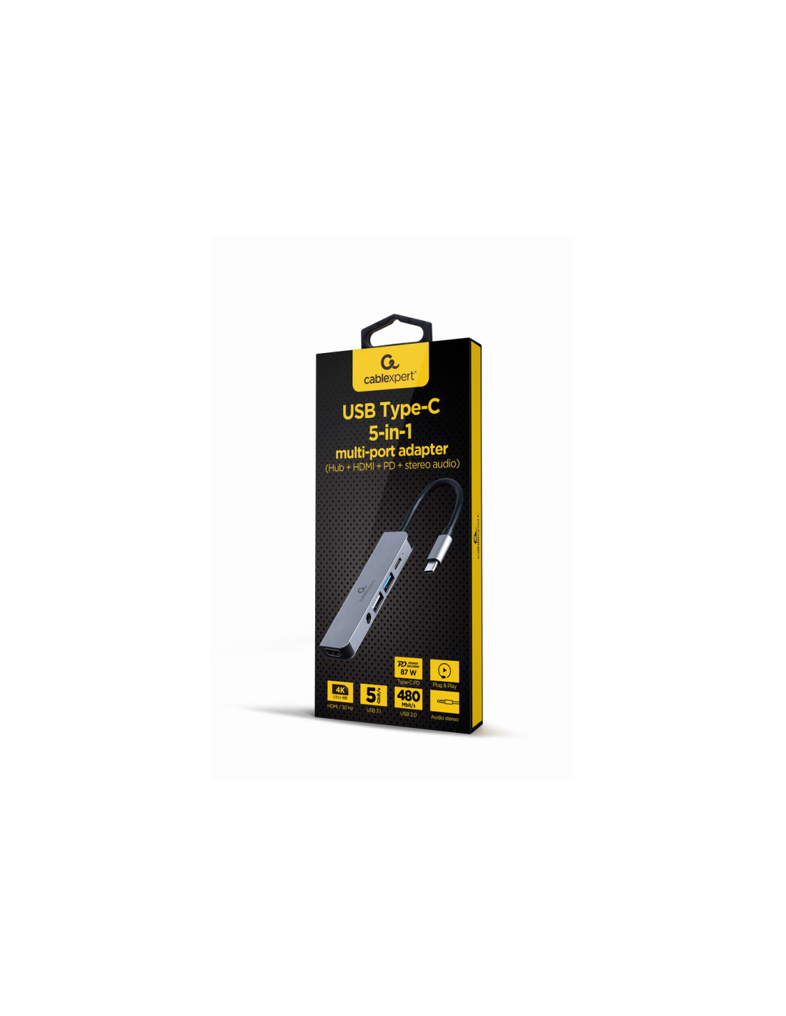 Gembird A-CM-COMBO5-02. Tecnología de conectividad: Alámbrico, Interfaz de host: USB 3.2 Gen 1 (3.1 Gen 1) Type-C, Entrega de energía USB (USB Power Delivery) de hasta: 87 W. Color del producto: Plata, Velocidad de transferencia de datos: 5 Gbit/s, Resolución (máxima digital): 3840 x 2160 Pixeles. Alimentación: USB, Conector eléctrico: USB Tipo C, Corriente de entrada: 0.2 A. Ancho: 28 mm, Profundidad: 104 mm, Altura: 10 mm. Ancho del paquete: 75 mm, Profundidad del paquete: 138 mm, Altura del paquete: 19 m